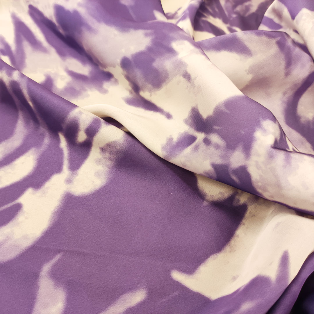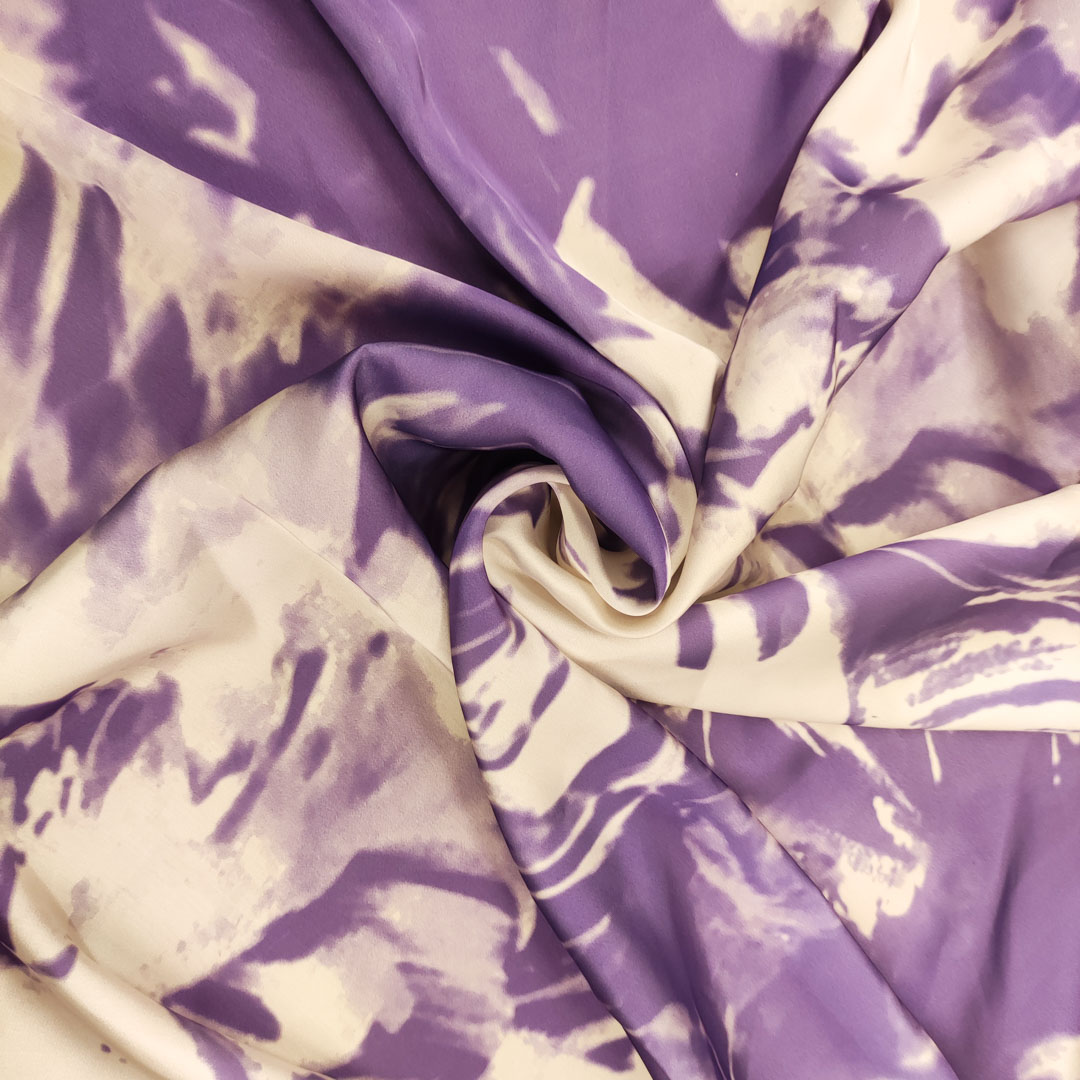 Tessuto Satin a fantasia motivo astratto panna – viola