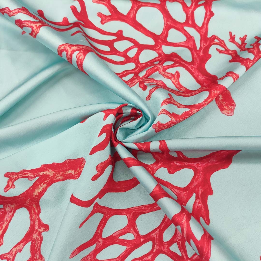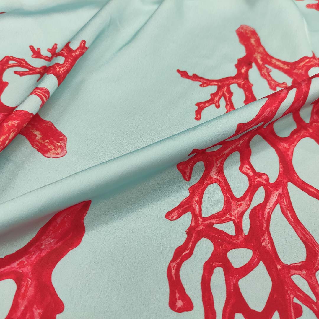 Tessuto Satin a fantasia motivo astratto verde acqua – rosso corallo