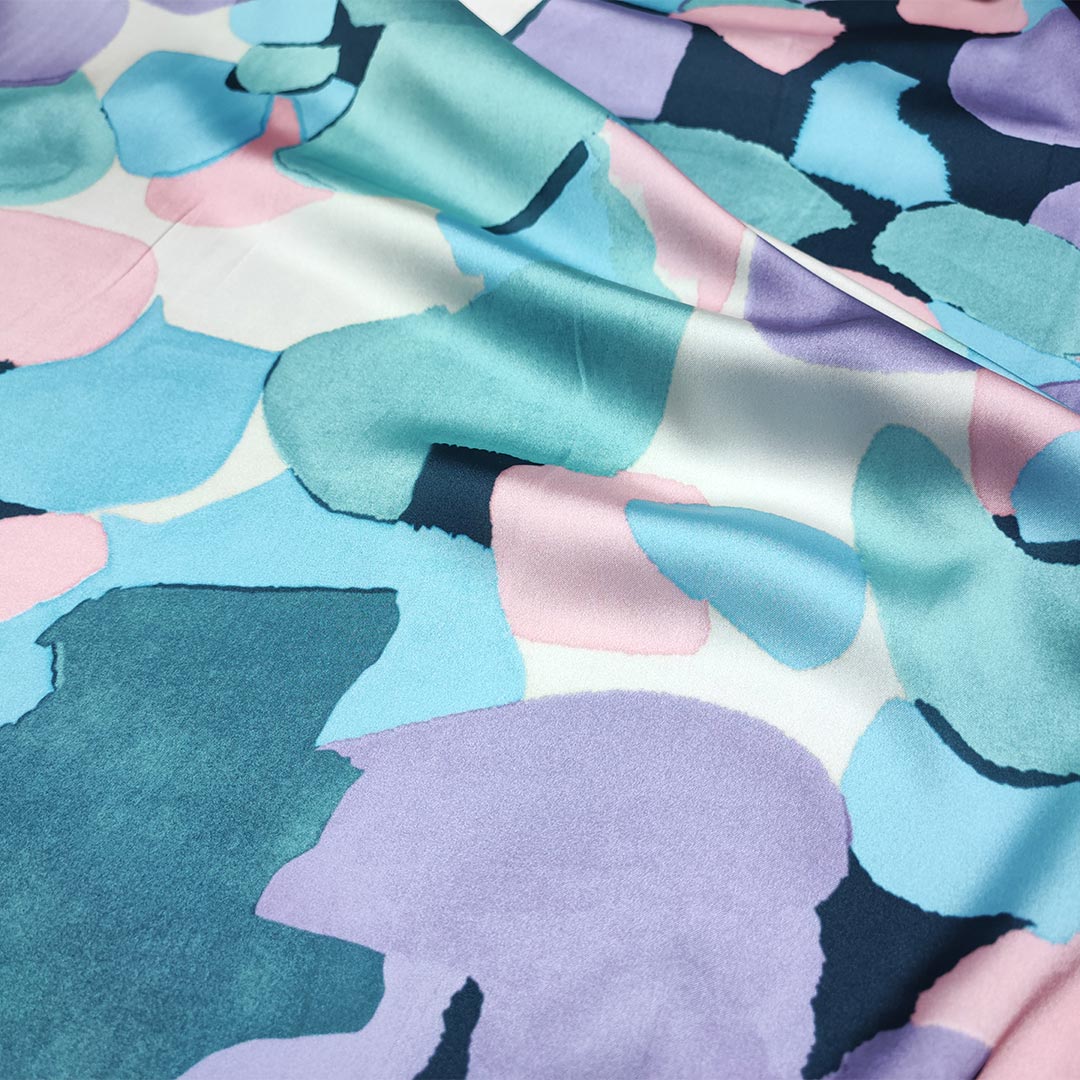 Tessuto Satin a fantasia motivo astratto verde petrolio – rosa – lilla