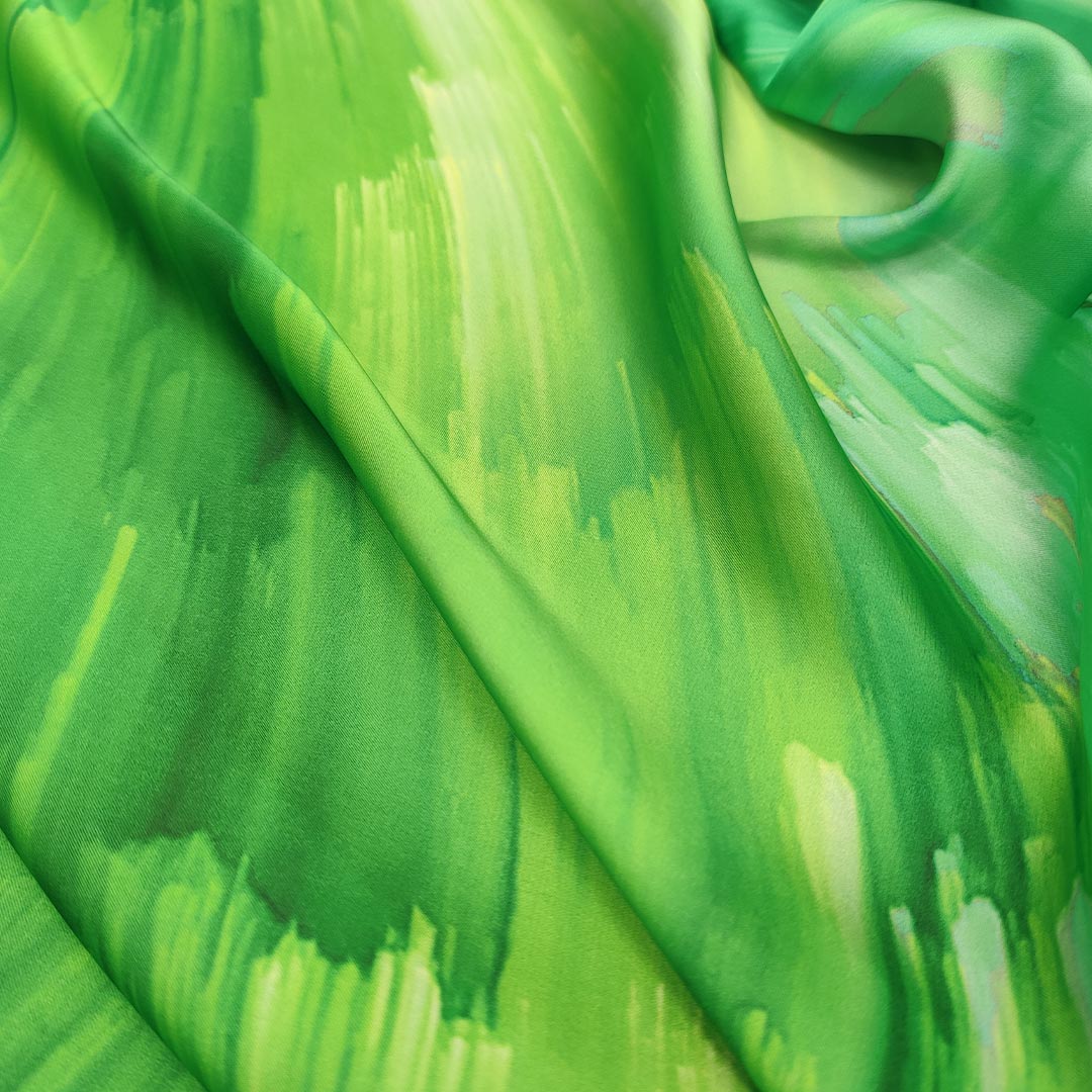 Tessuto Satin a fantasia motivo astratto verde prato – verde chiaro – verde fluo