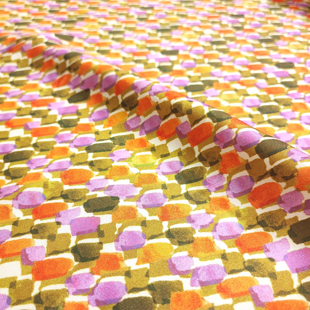 Tessuto Satin a fantasia motivo astratto viola – arancione – verde