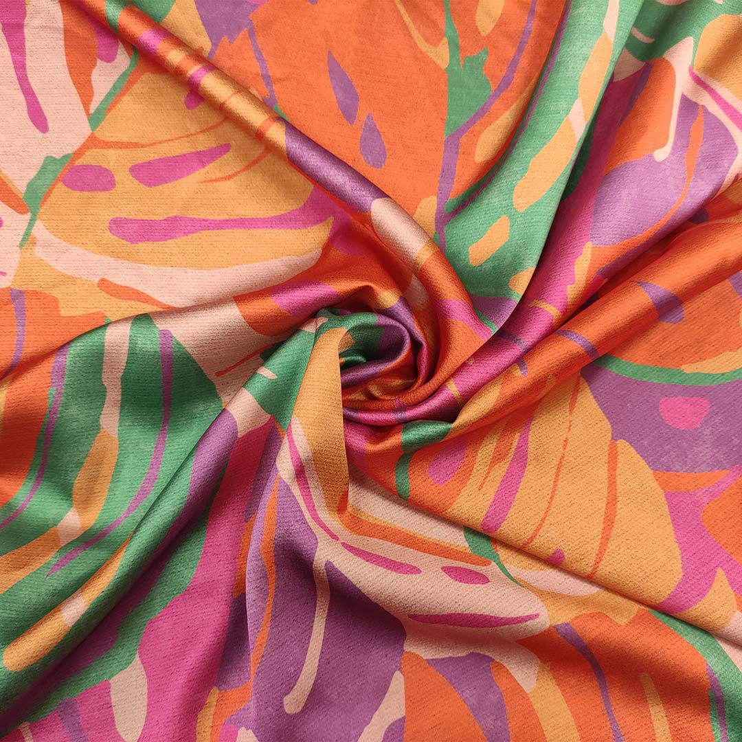 Tessuto Satin a fantasia motivo floreale arancione – viola – verde