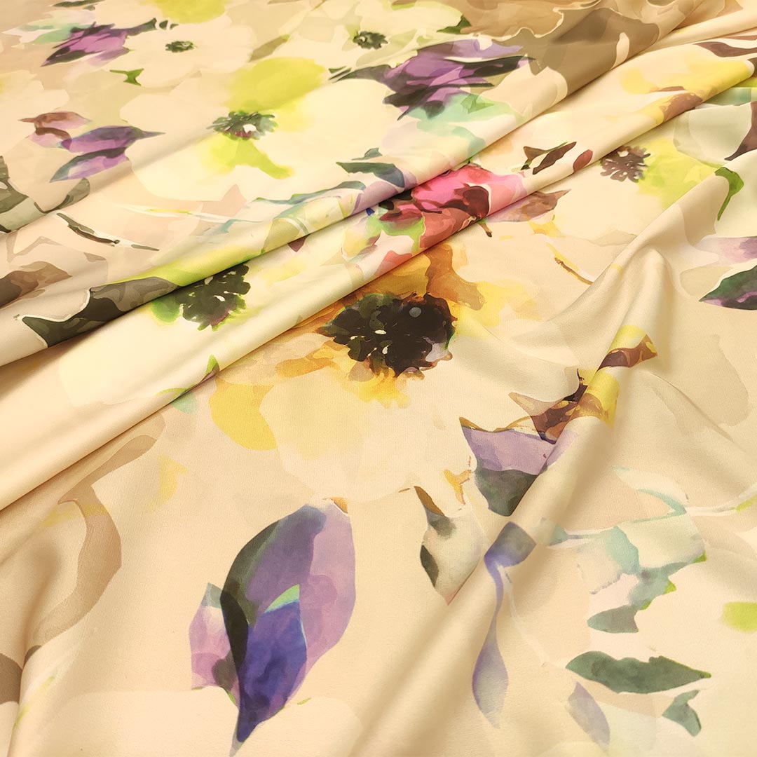 Tessuto Satin a fantasia motivo floreale beige – verde acido – viola