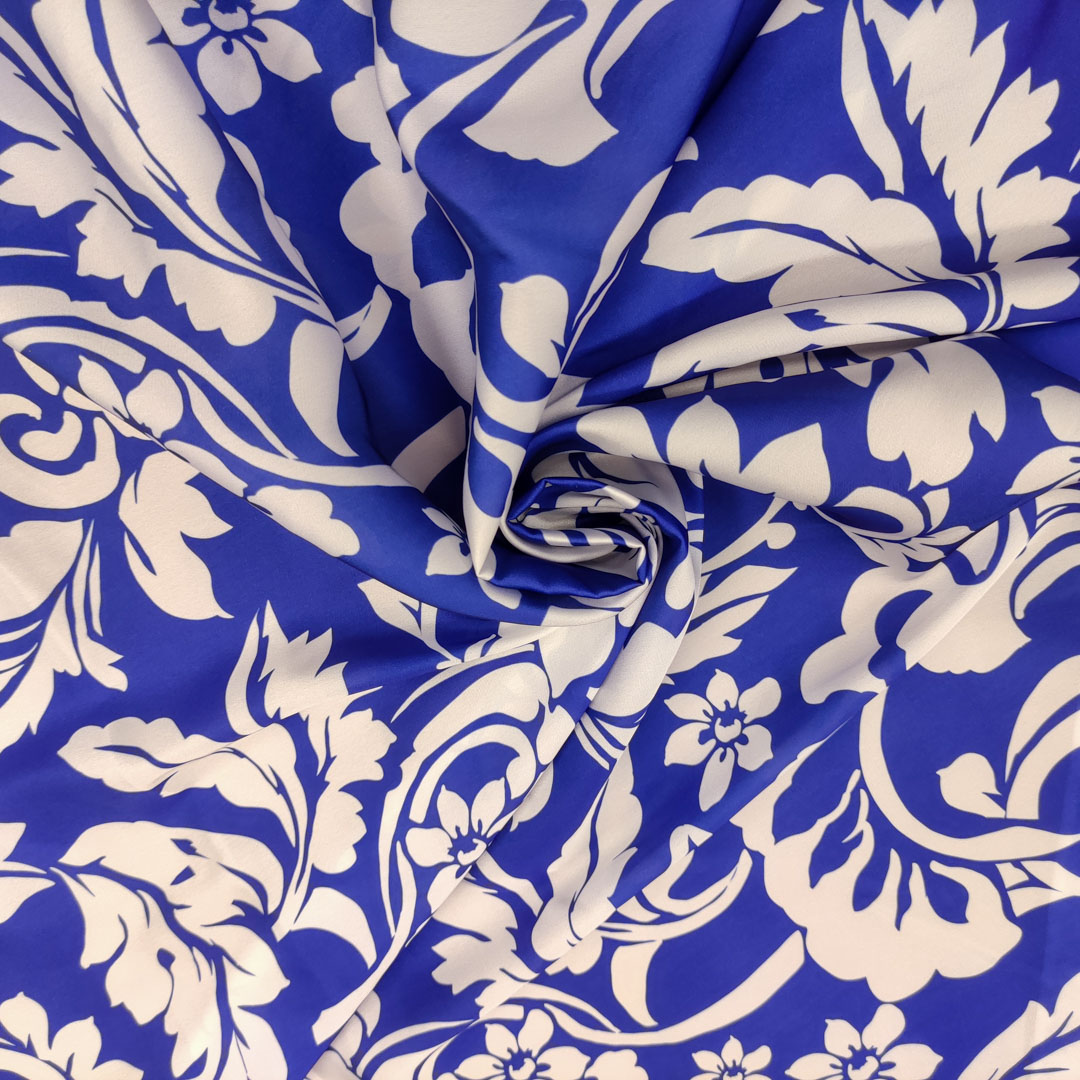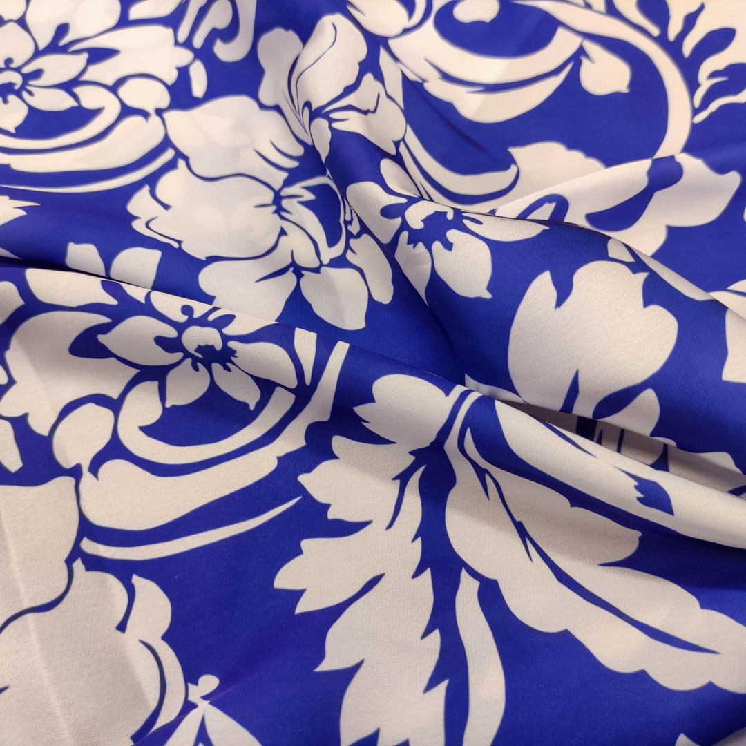 Tessuto Satin a fantasia motivo floreale bianco – blu elettrico