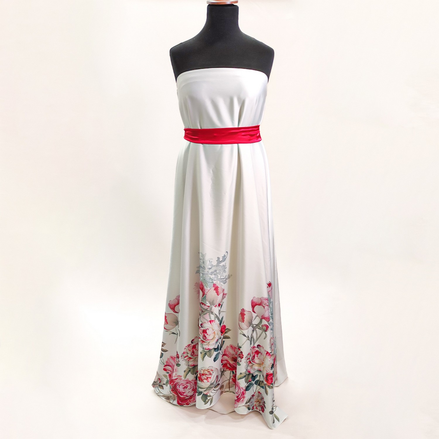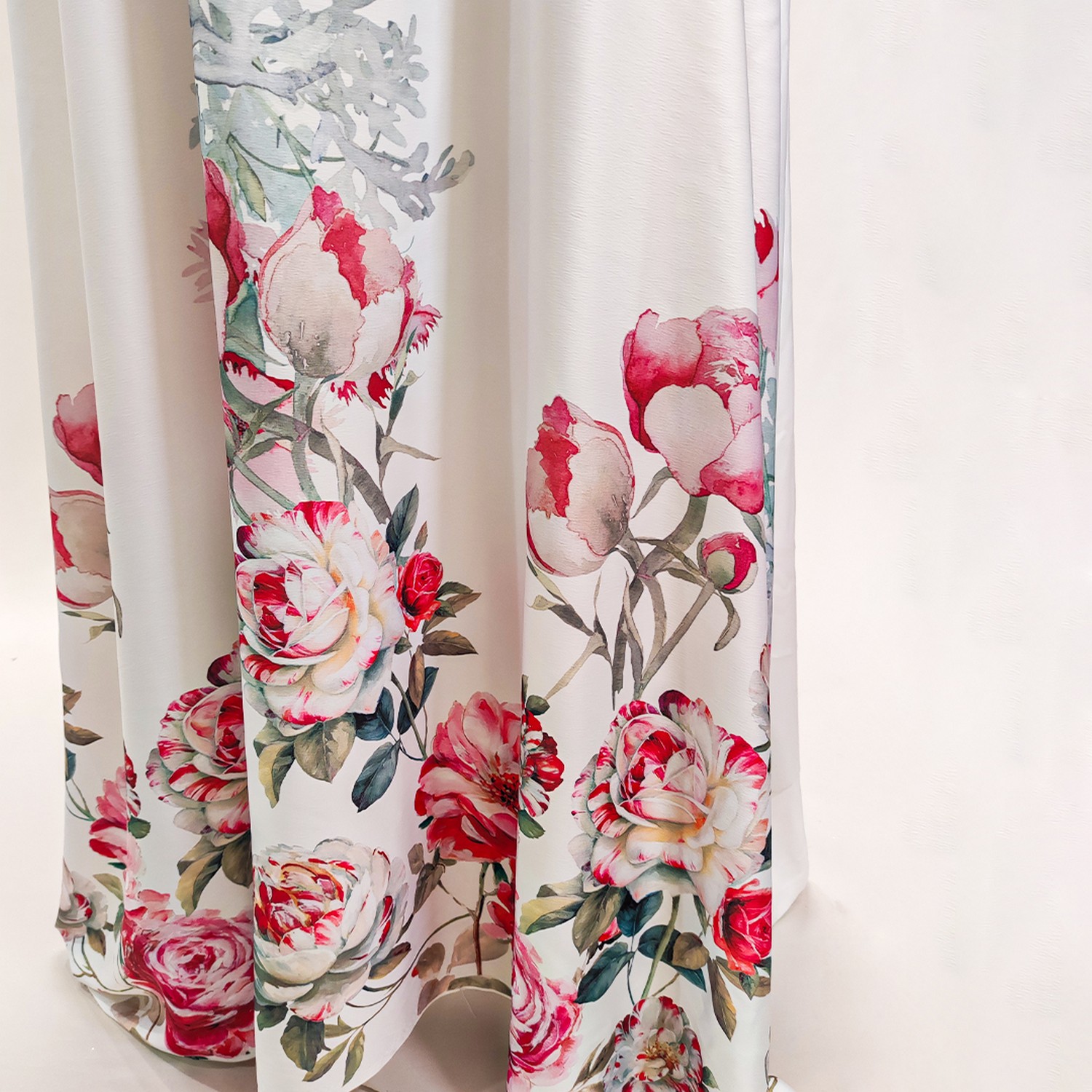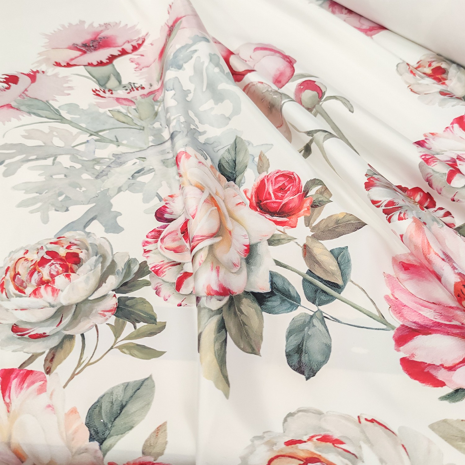Tessuto Satin a fantasia motivo floreale bianco – rosso – fucsia