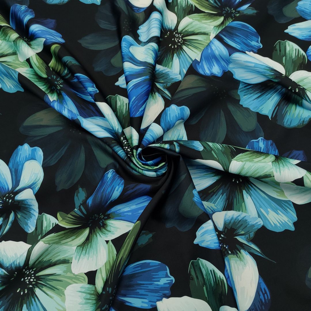 Tessuto Satin a fantasia motivo floreale bianco – turchese nero – celeste – verde