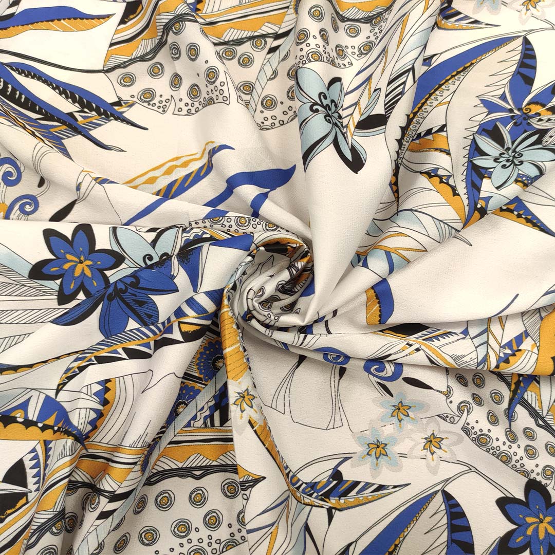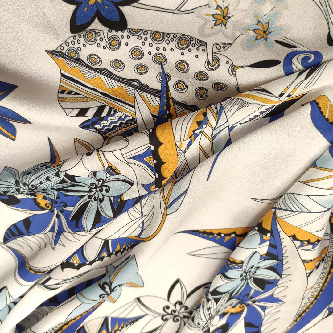 Tessuto Satin a fantasia motivo floreale blu – bianco – senape