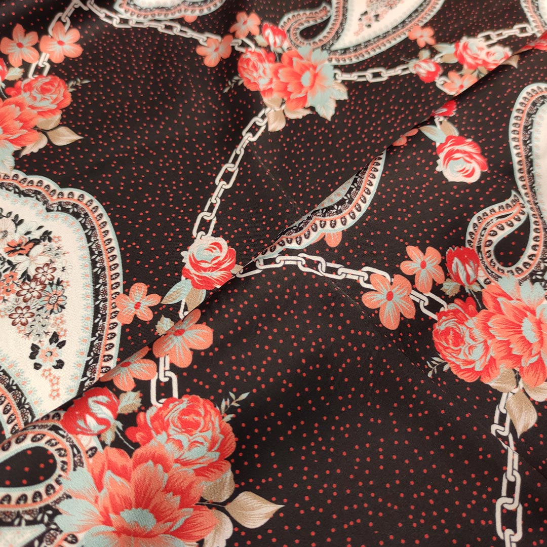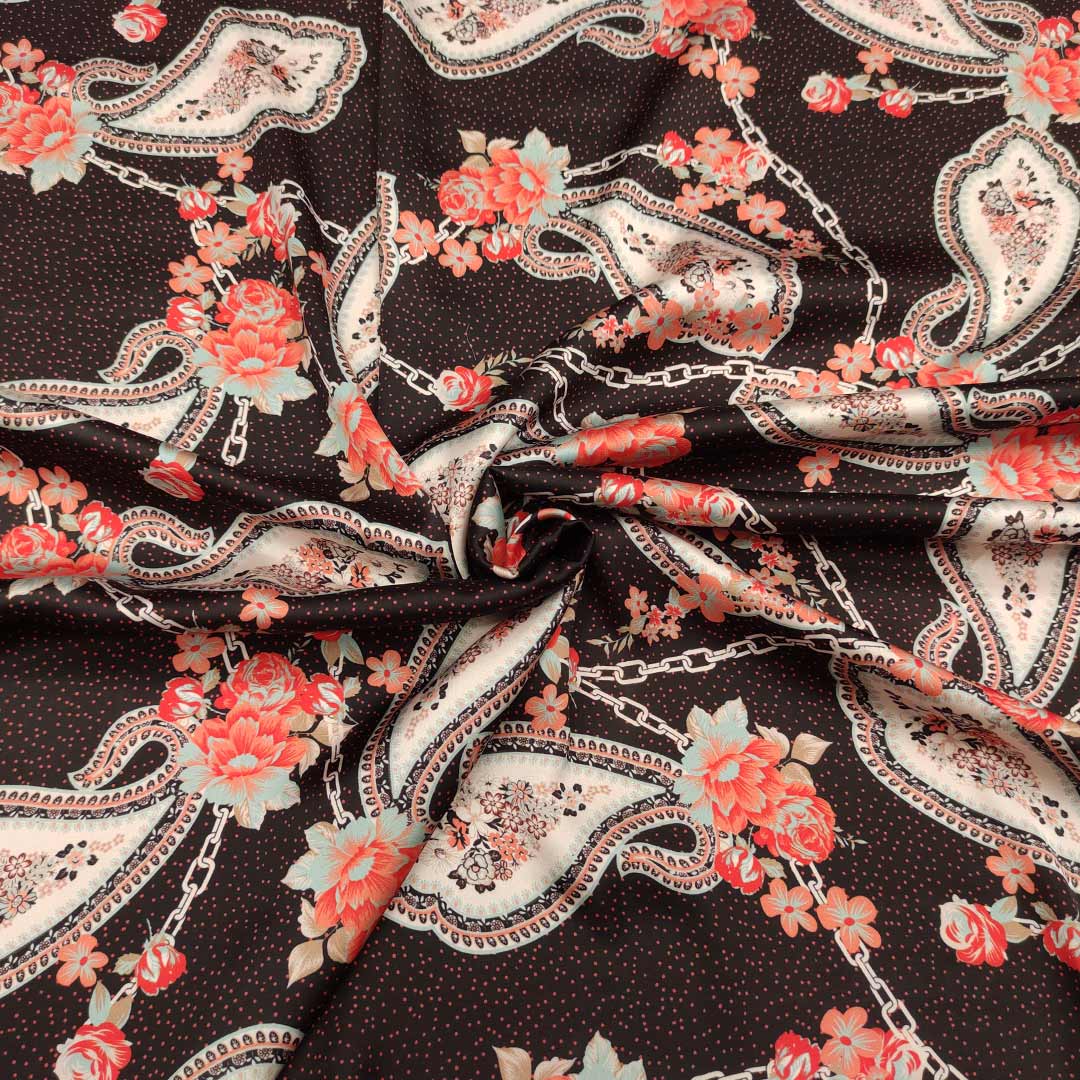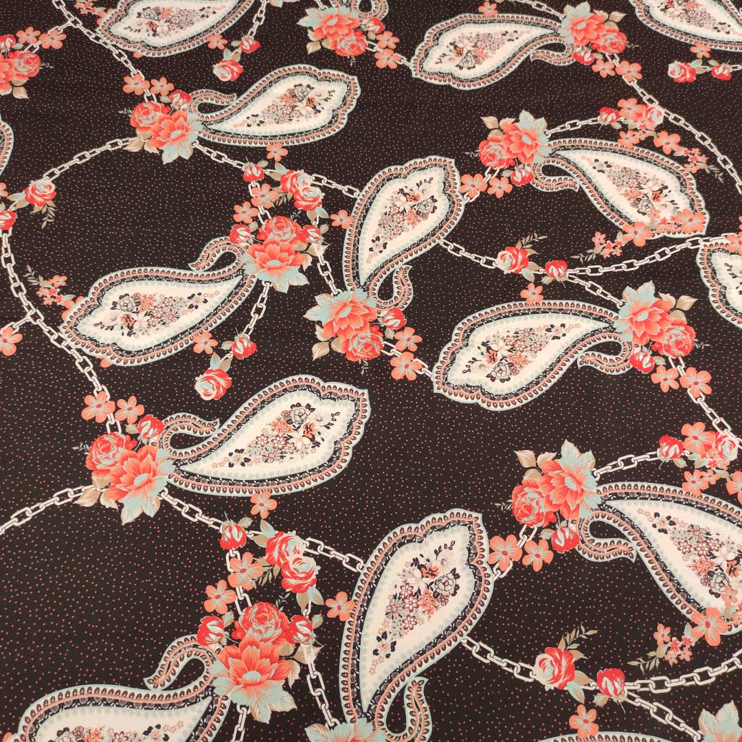 Tessuto Satin a fantasia motivo floreale cahmere nero – panna – arancione – tiffany