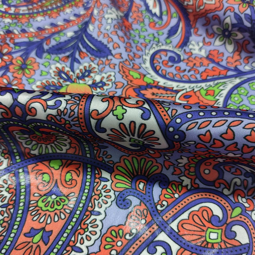 Tessuto Satin a fantasia motivo floreale cashmere blu – verde – arancione