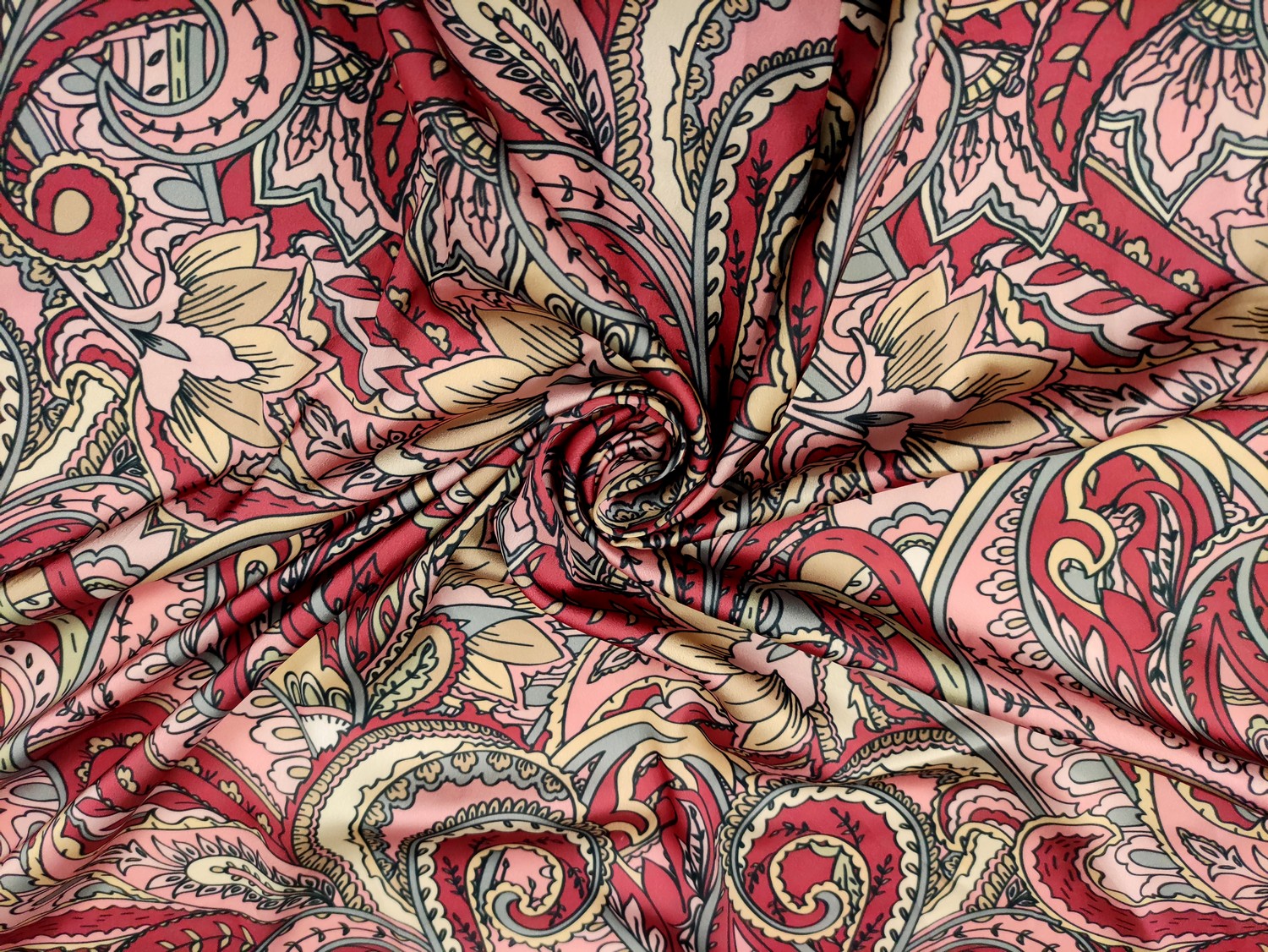 Tessuto Satin a fantasia motivo floreale cashmere rosa – berry