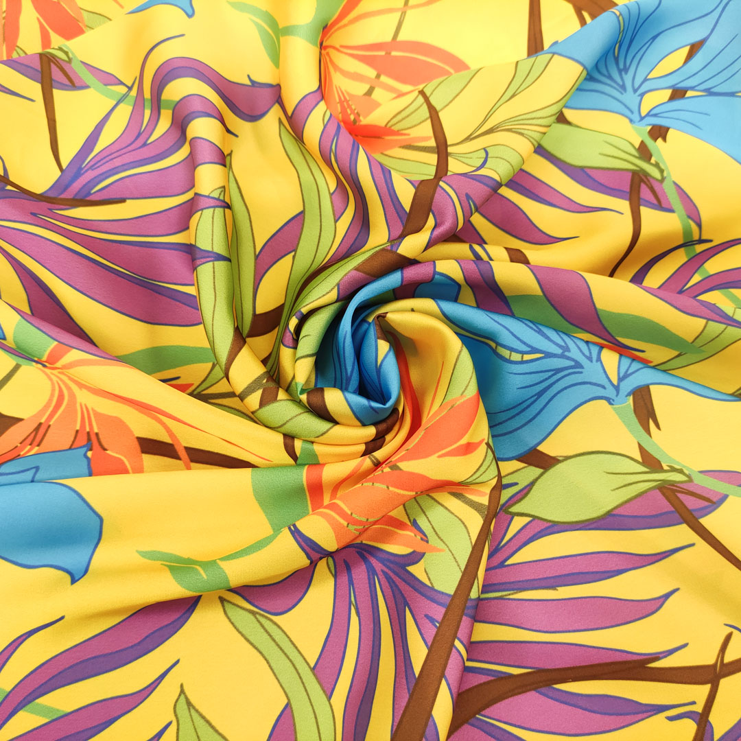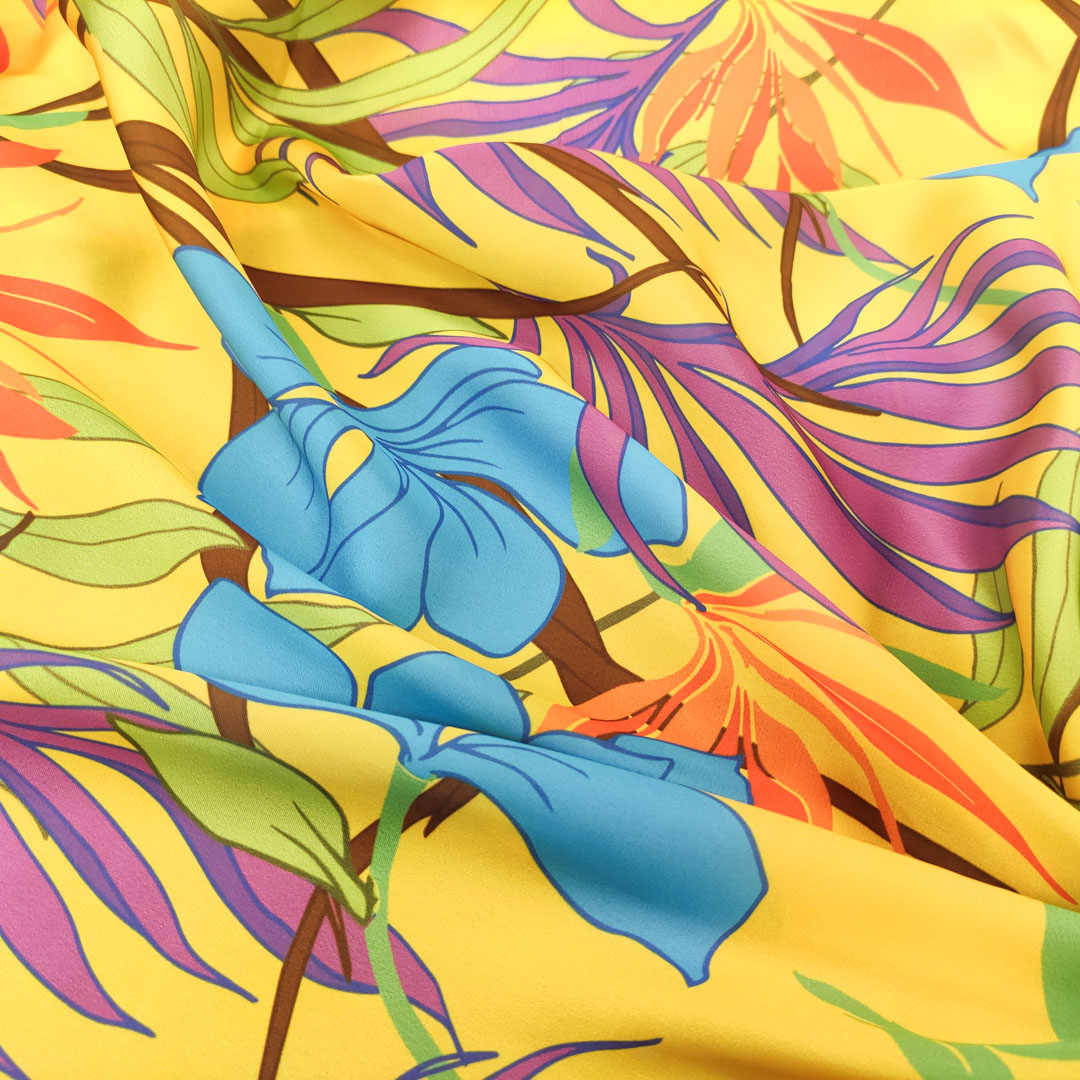 Tessuto Satin a fantasia motivo floreale giallo – azzurro – viola