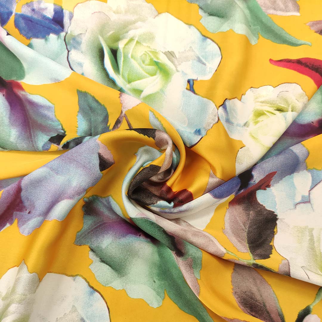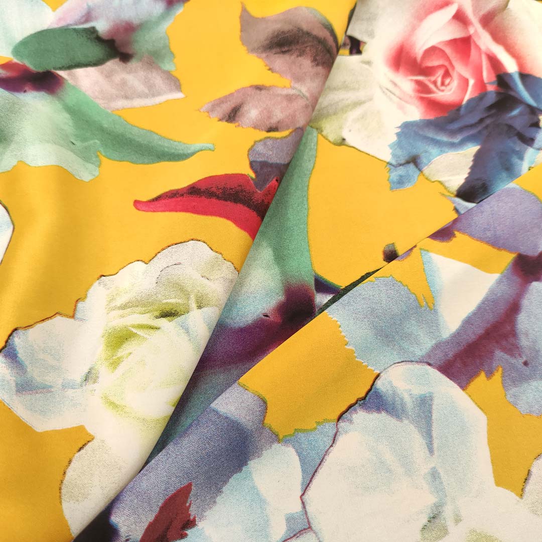 Tessuto Satin a fantasia motivo floreale giallo – viola – tiffany