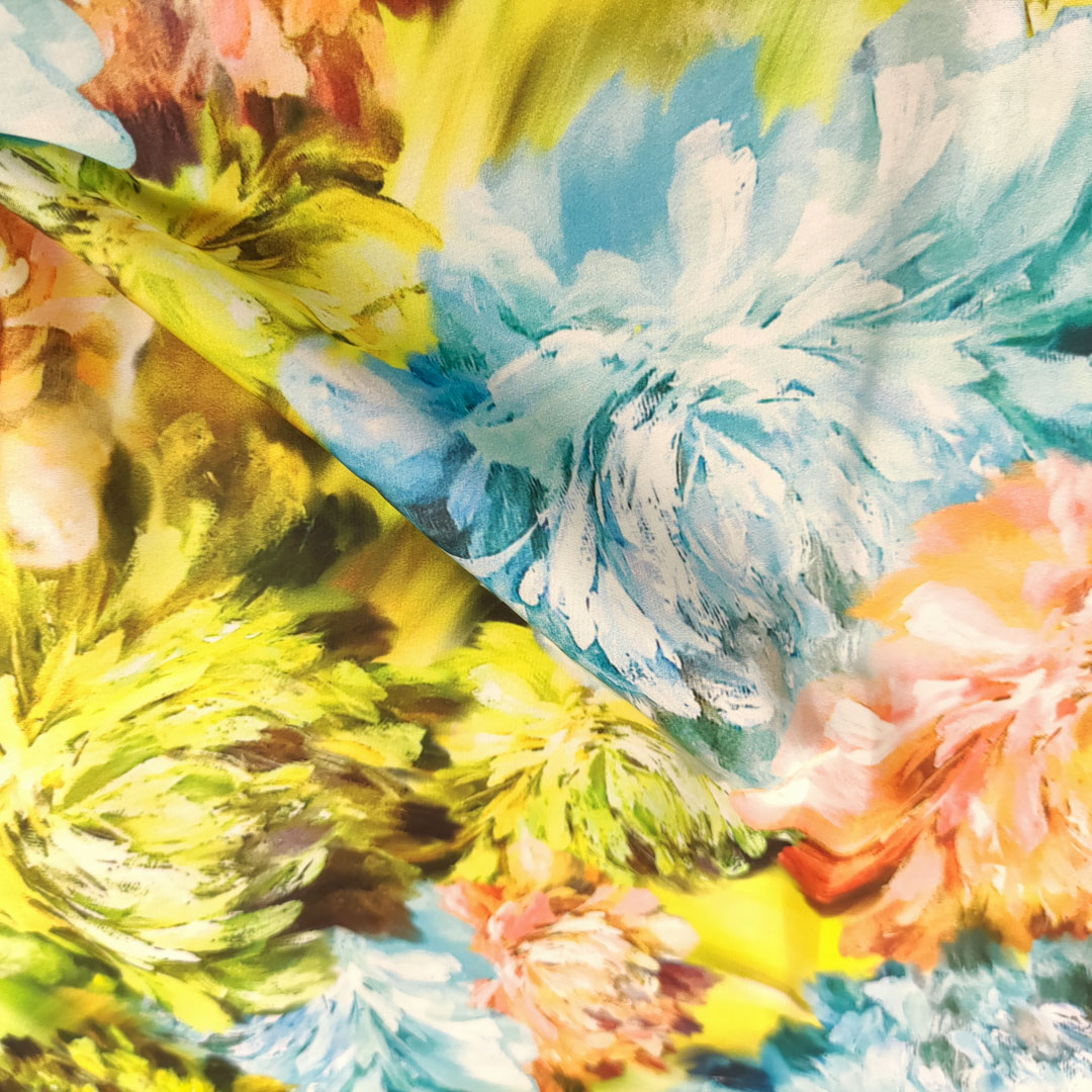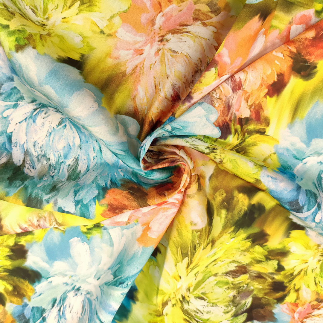 Tessuto Satin a fantasia motivo floreale mela – acquamarina – arancione