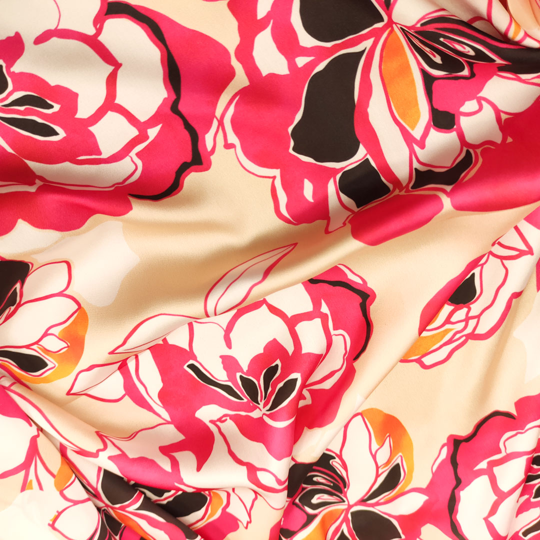 Tessuto Satin a fantasia motivo floreale nero – beige – fucsia