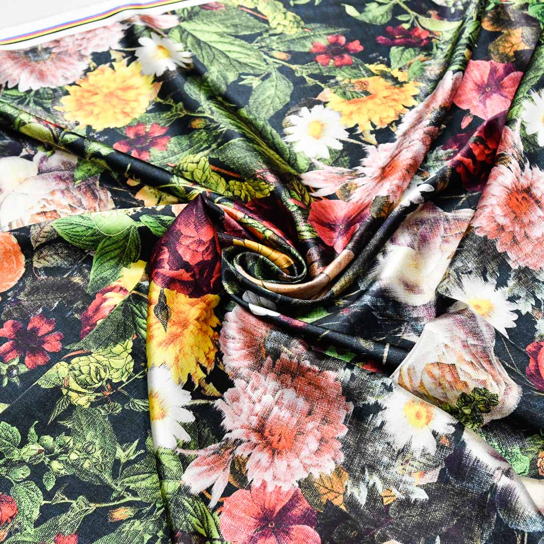 Tessuto Satin a fantasia motivo floreale nero – giallo – rosso – verde