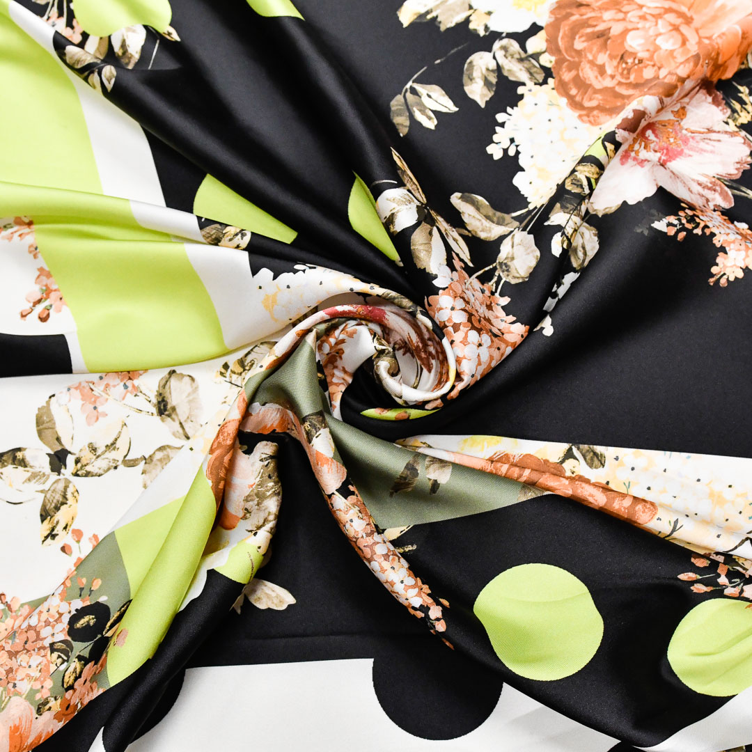 Tessuto Satin a fantasia motivo floreale nero – mela – rosa