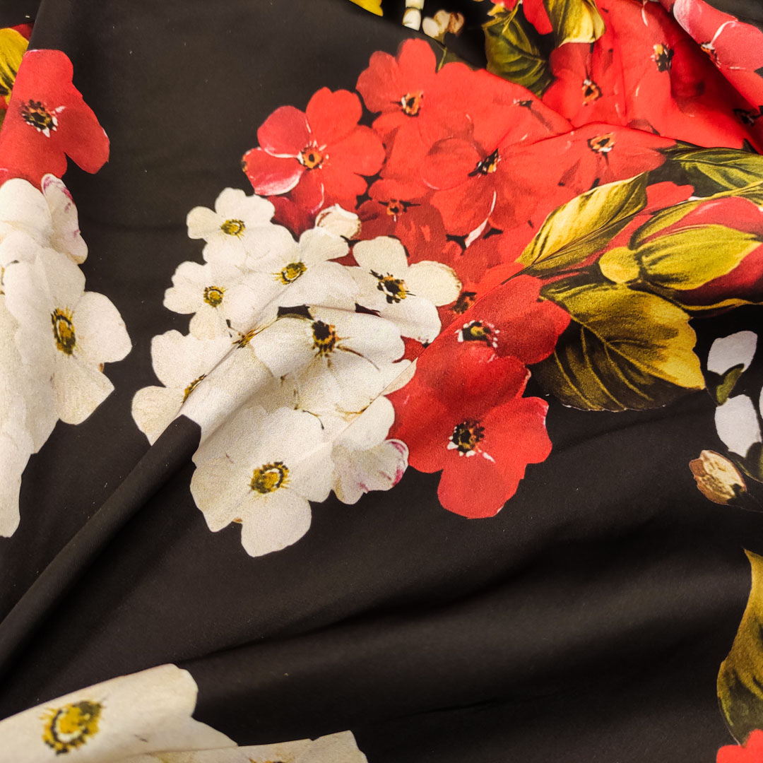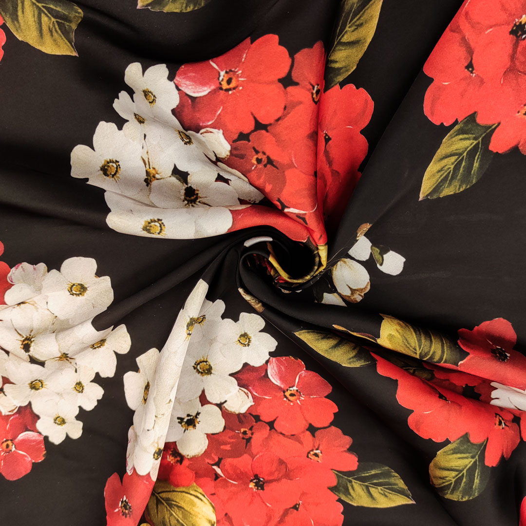 Tessuto Satin a fantasia motivo floreale nero – rosso – panna