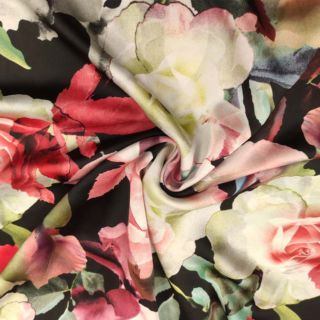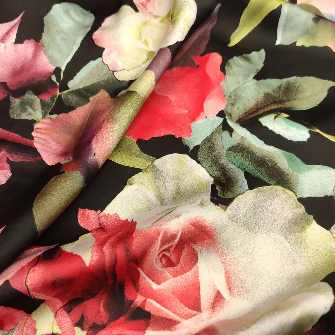 Tessuto Satin a fantasia motivo floreale nero – rosso – rosa