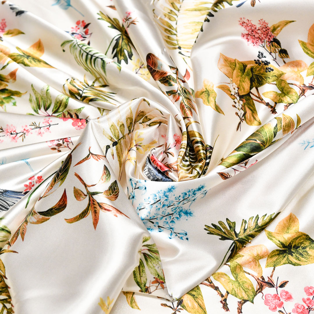 Tessuto Satin a fantasia dalla mano morbida, cadente e fluida, dall’aspetto semilucido si presta alla creazione di capi fluenti e morbidi da utilizzare in tutte le stagioni come: camicie, abiti, gonne, bluse, tute jumpsuit e pantaloni.