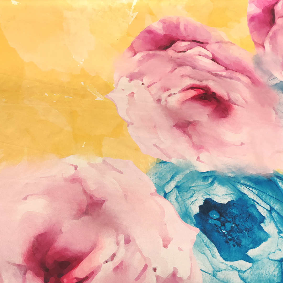 Tessuto Satin a fantasia motivo floreale rosa – fucsia -turchese – giallo