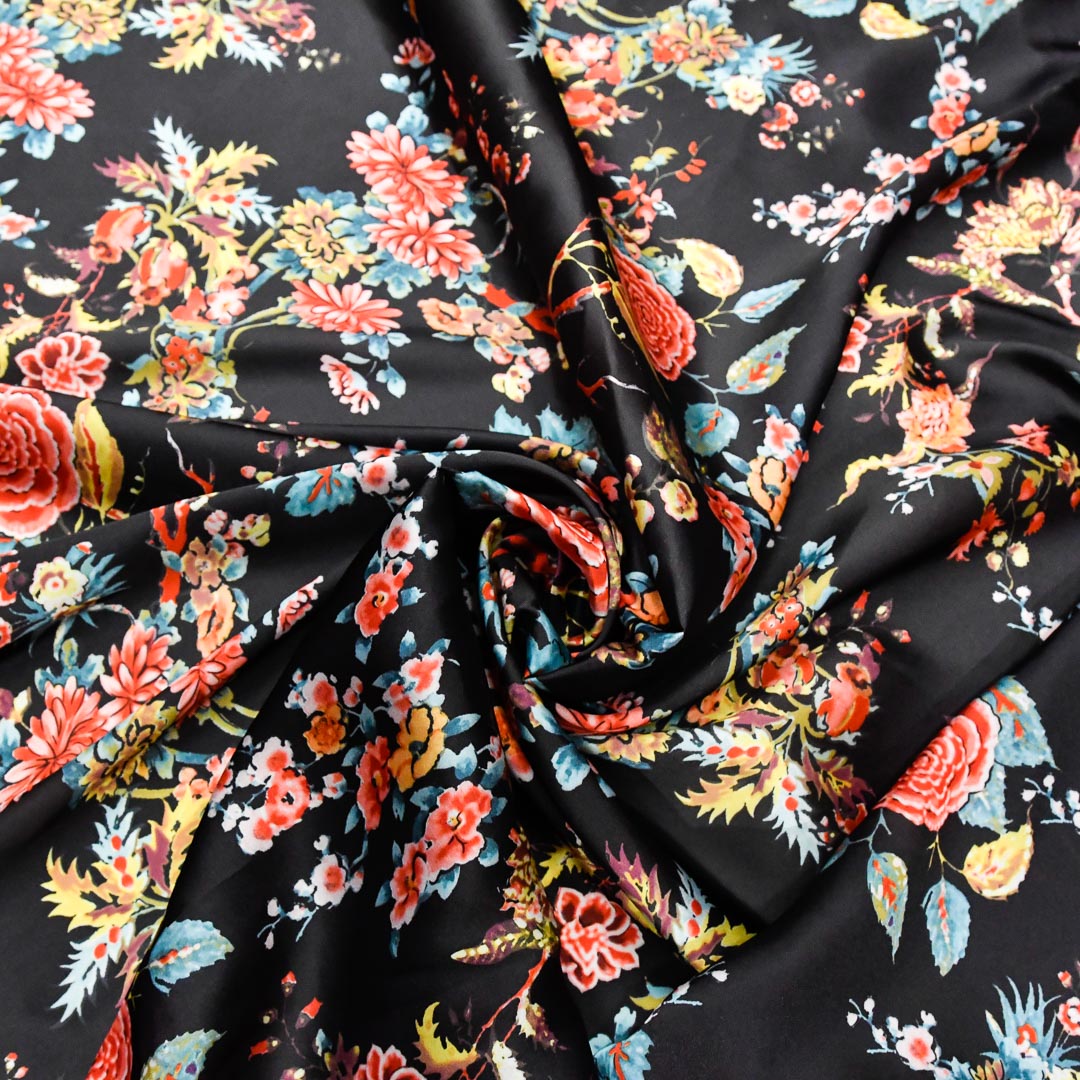 Tessuto Satin a fantasia motivo floreale rosso – nero – verde
