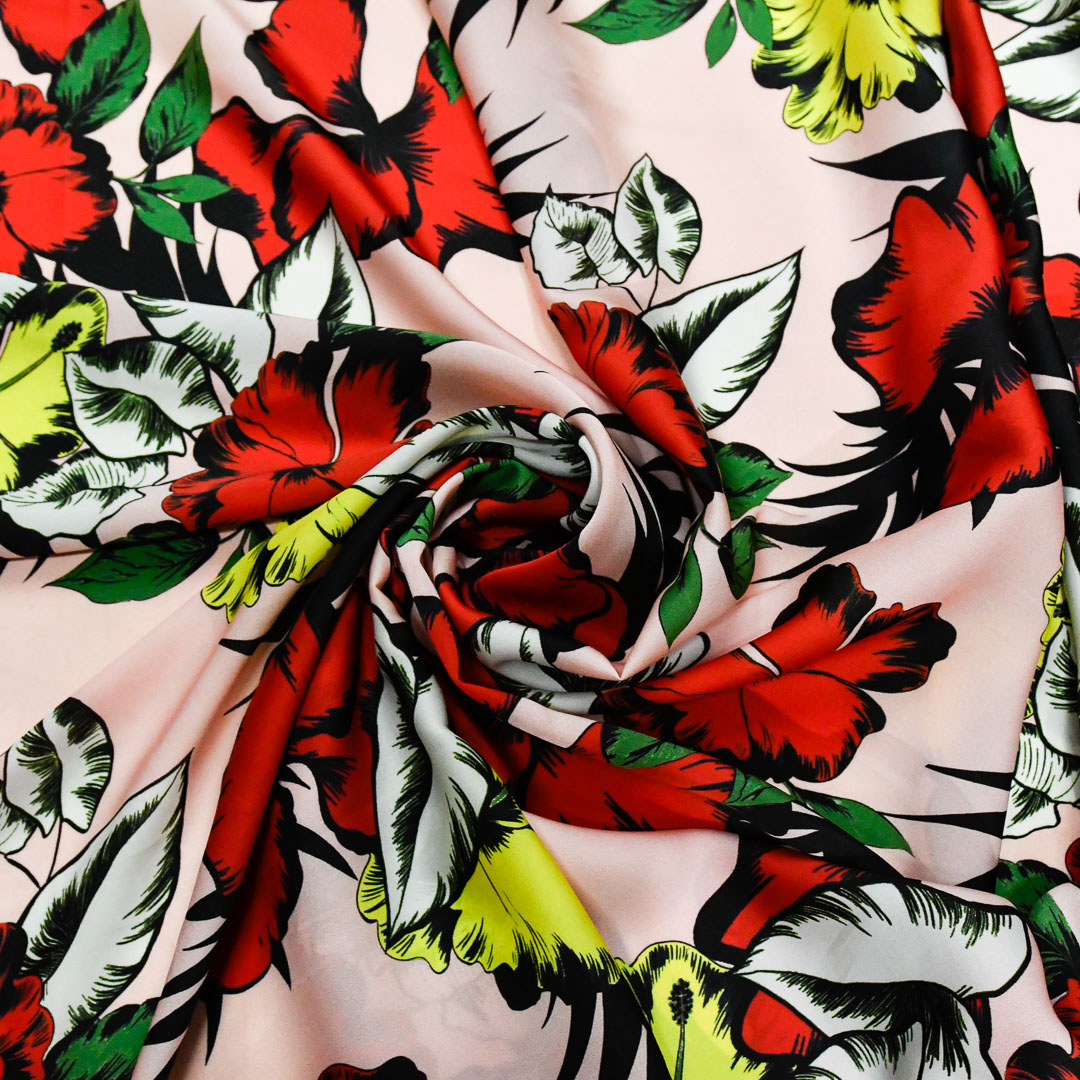 Tessuto Satin a fantasia motivo floreale rosso – rosa – giallo