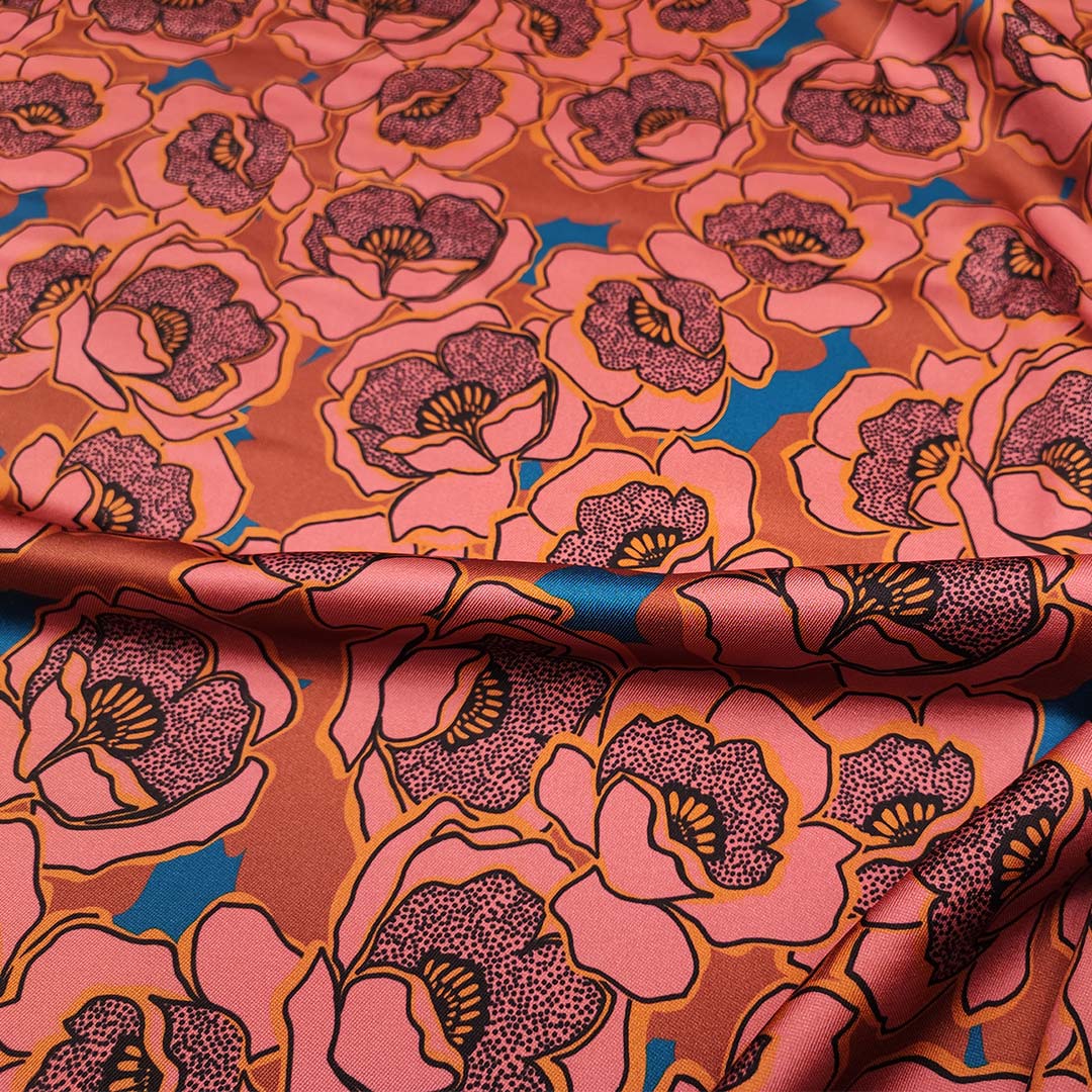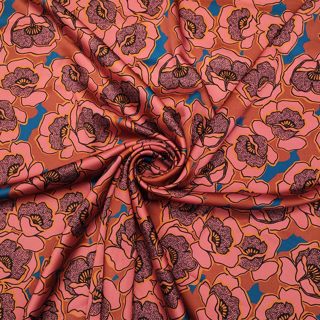 Tessuto Satin a fantasia motivo floreale ruggine – geranio – verde ottanio