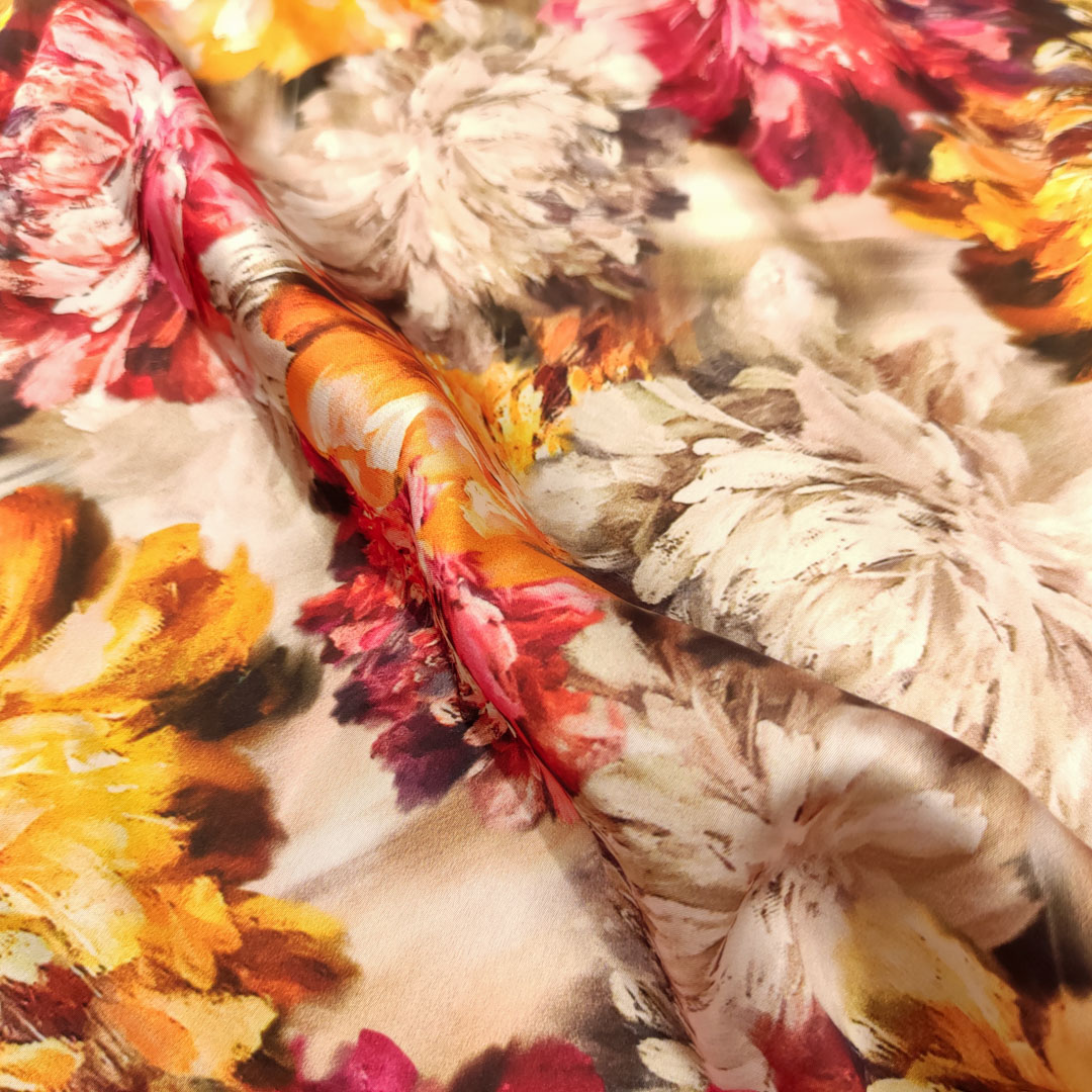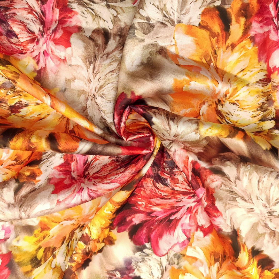 Tessuto Satin a fantasia motivo floreale tortora – arancione – azalea
