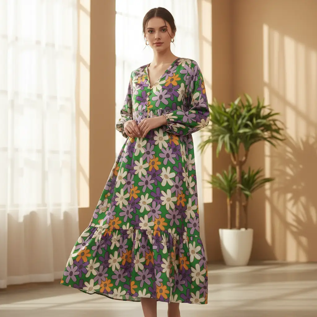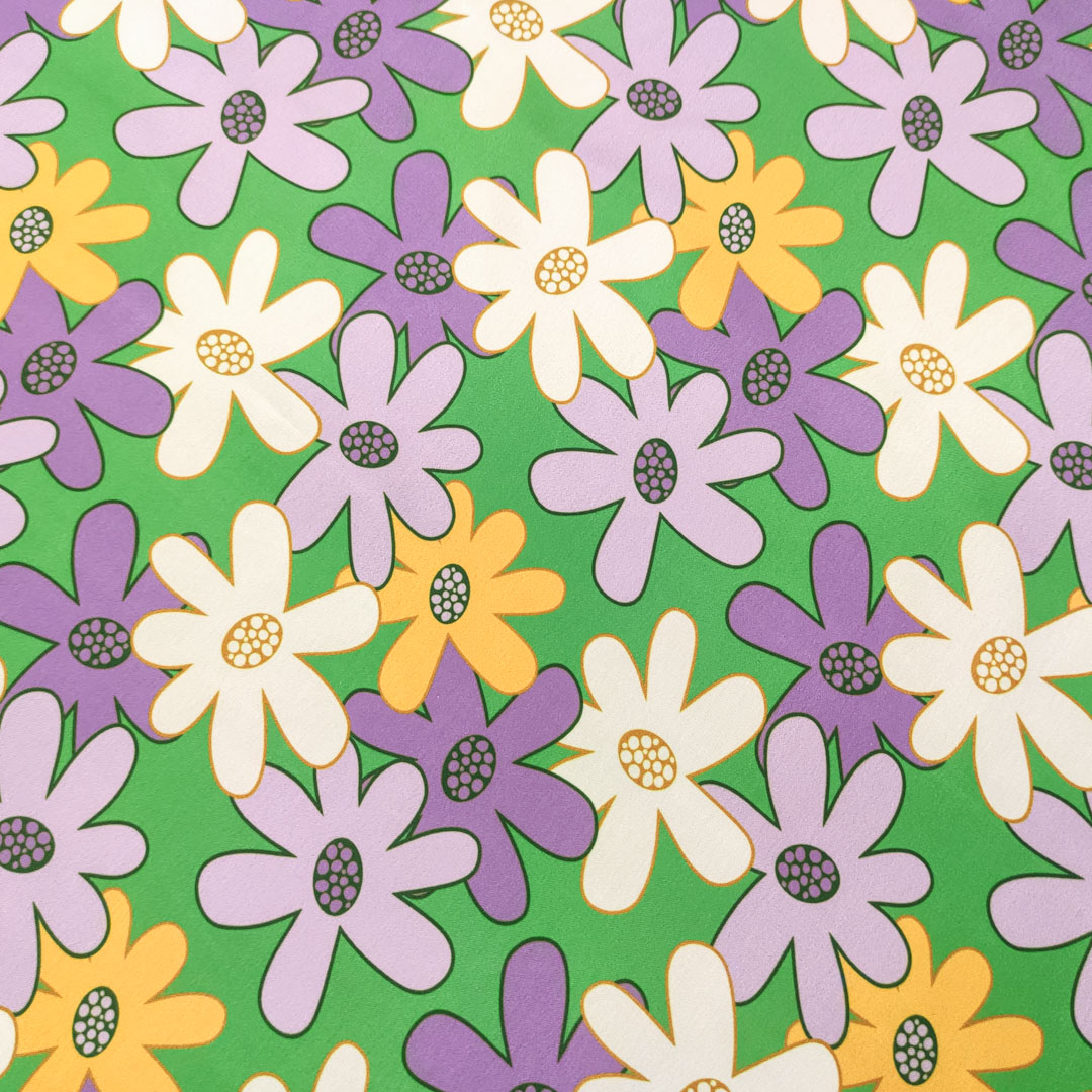 Tessuto Satin a fantasia motivo floreale verde – lilla – viola