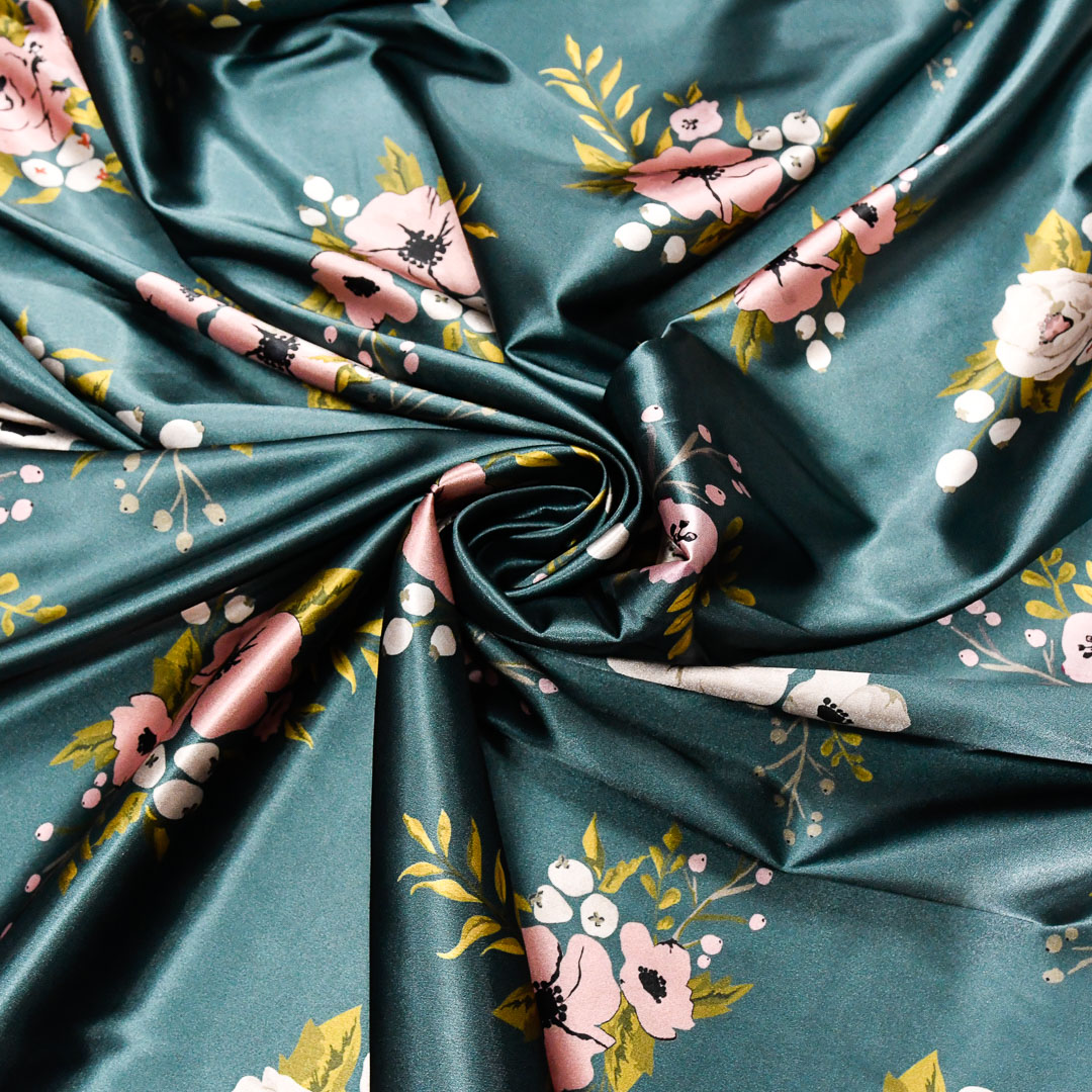 Tessuto Satin a fantasia motivo floreale verde petrolio – rosa