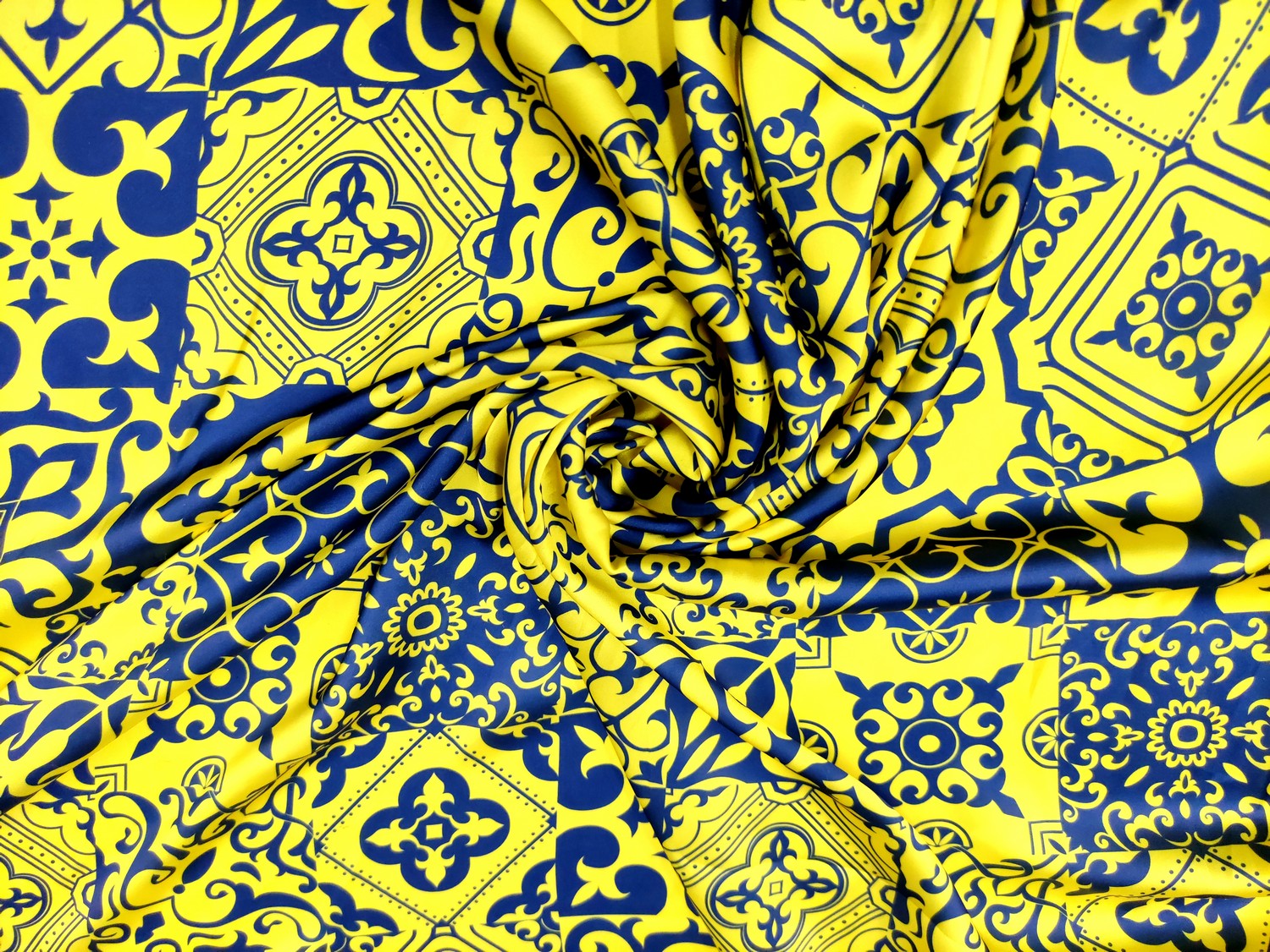 Tessuto Satin a fantasia motivo geometrico giallo – blu elettrico