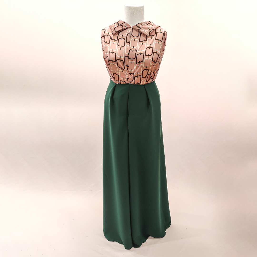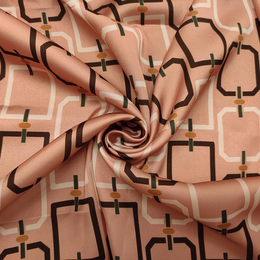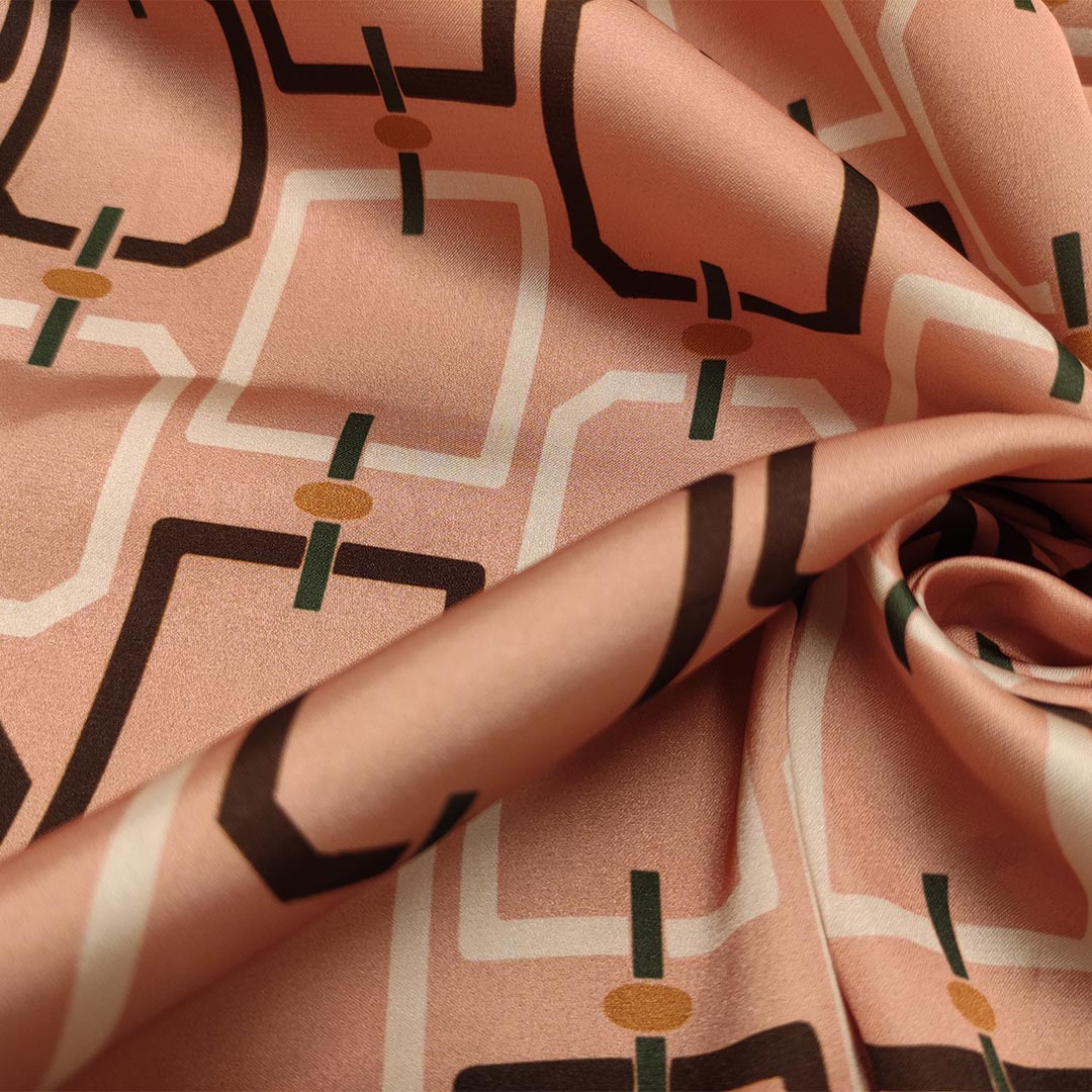 Tessuto Satin a fantasia motivo geometrico rosa – ocra – verde bottiglia