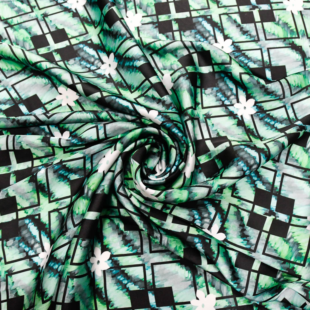 Tessuto Satin a fantasia motivo geometrico verde – nero – bianco