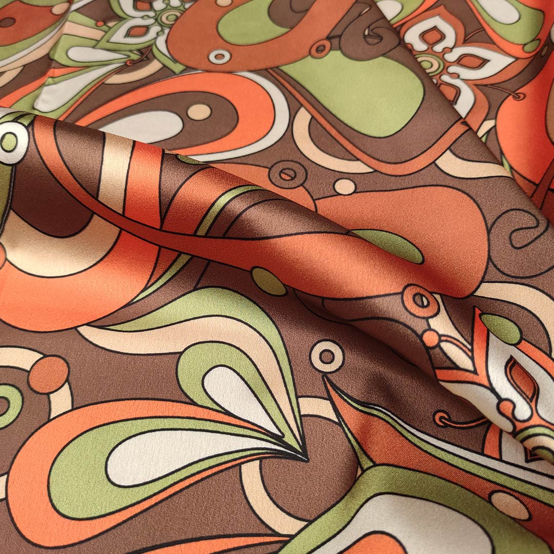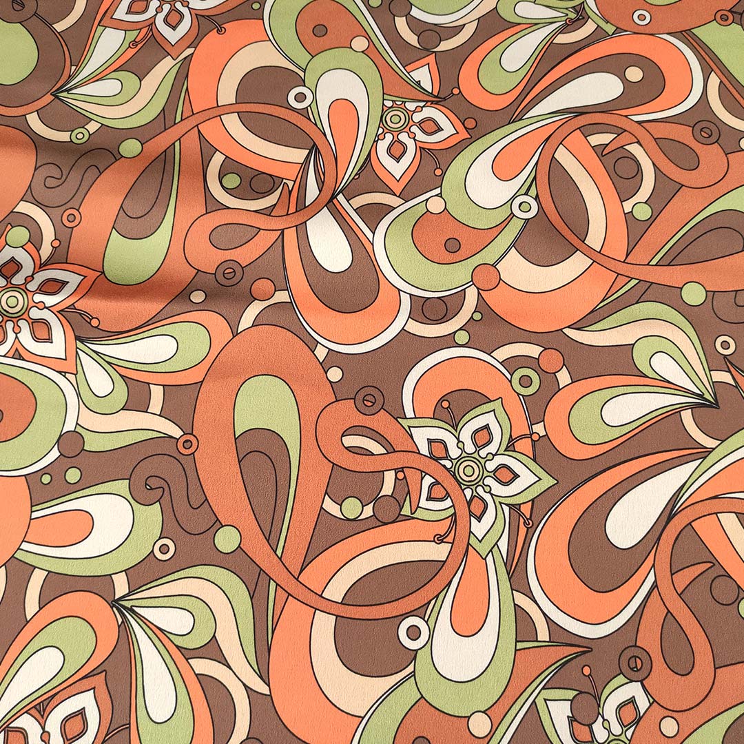 Tessuto Satin elasticizzato a fantasia motivo astratto arancio – marrone – verdino
