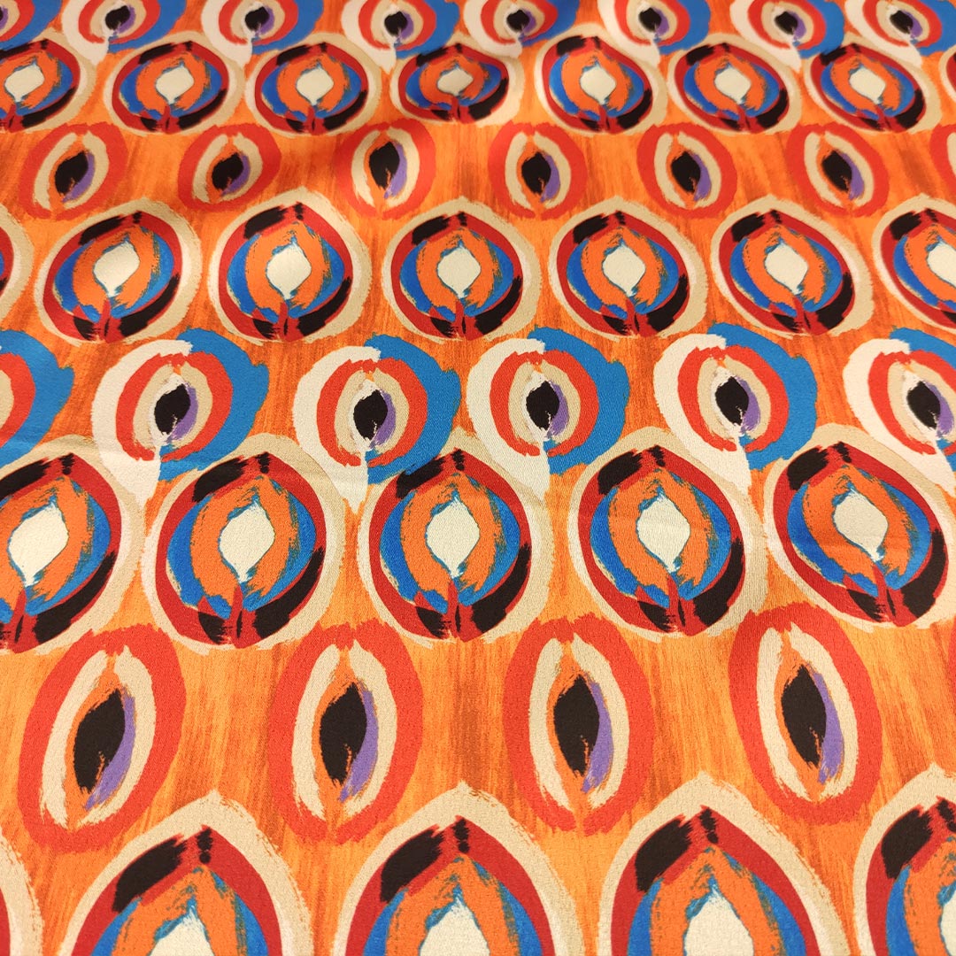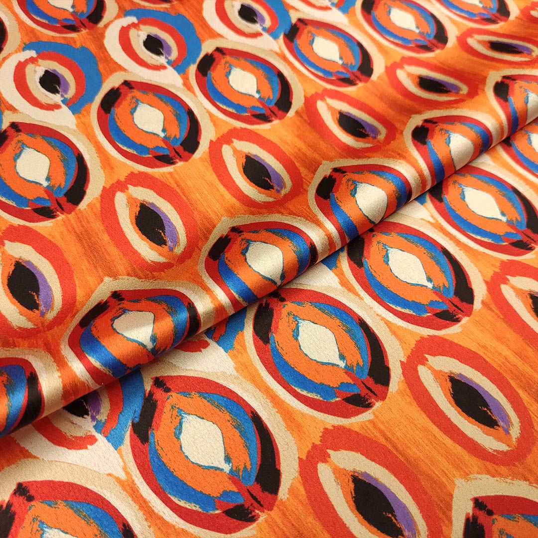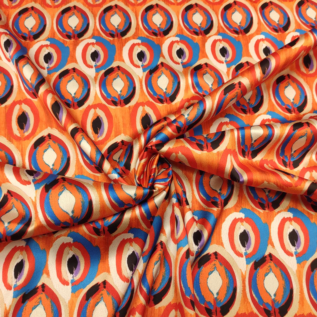 Tessuto Satin elasticizzato a fantasia motivo astratto arancione – blu – lilla – nero