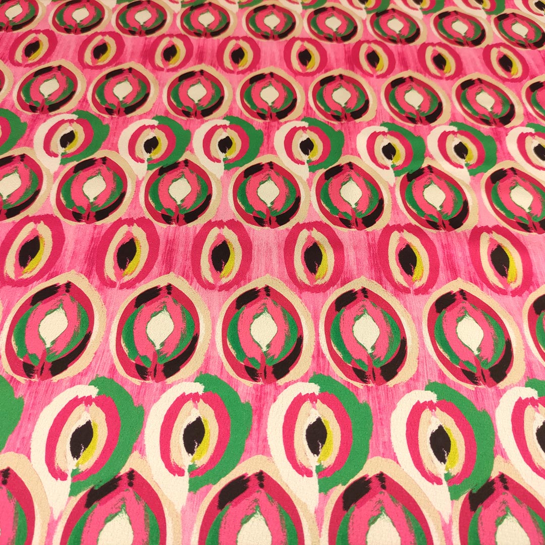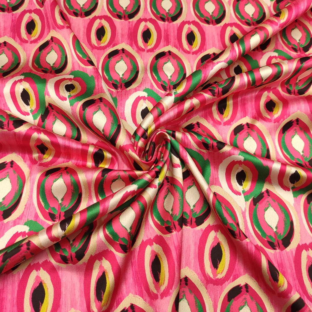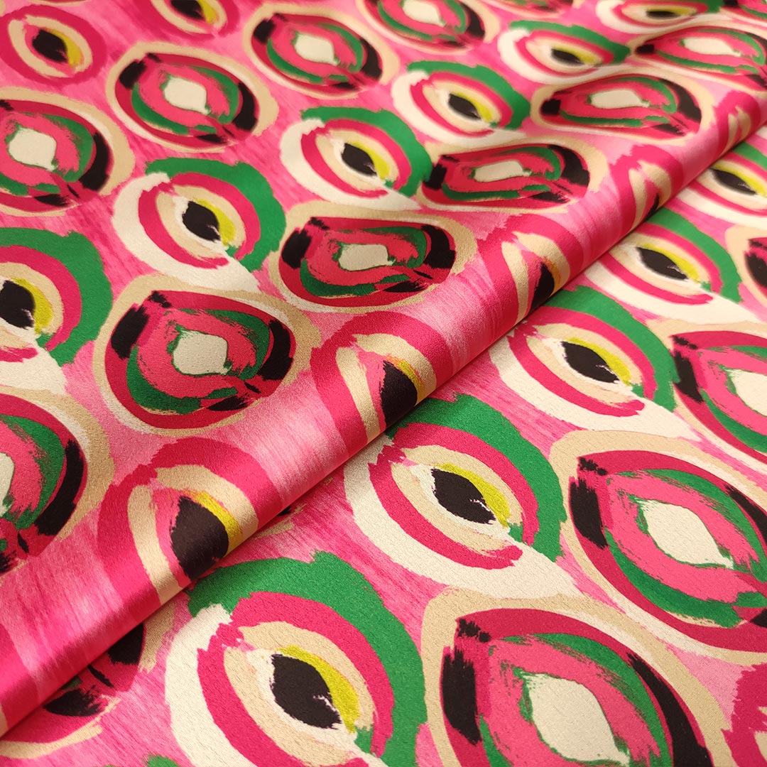 Tessuto Satin elasticizzato a fantasia motivo astratto fucsia – verde – panna – nero