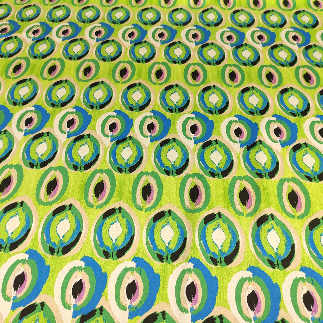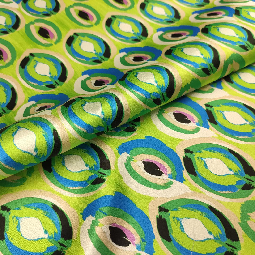 Tessuto Satin elasticizzato a fantasia motivo astratto verde fluo – blu elettrico – verde – panna