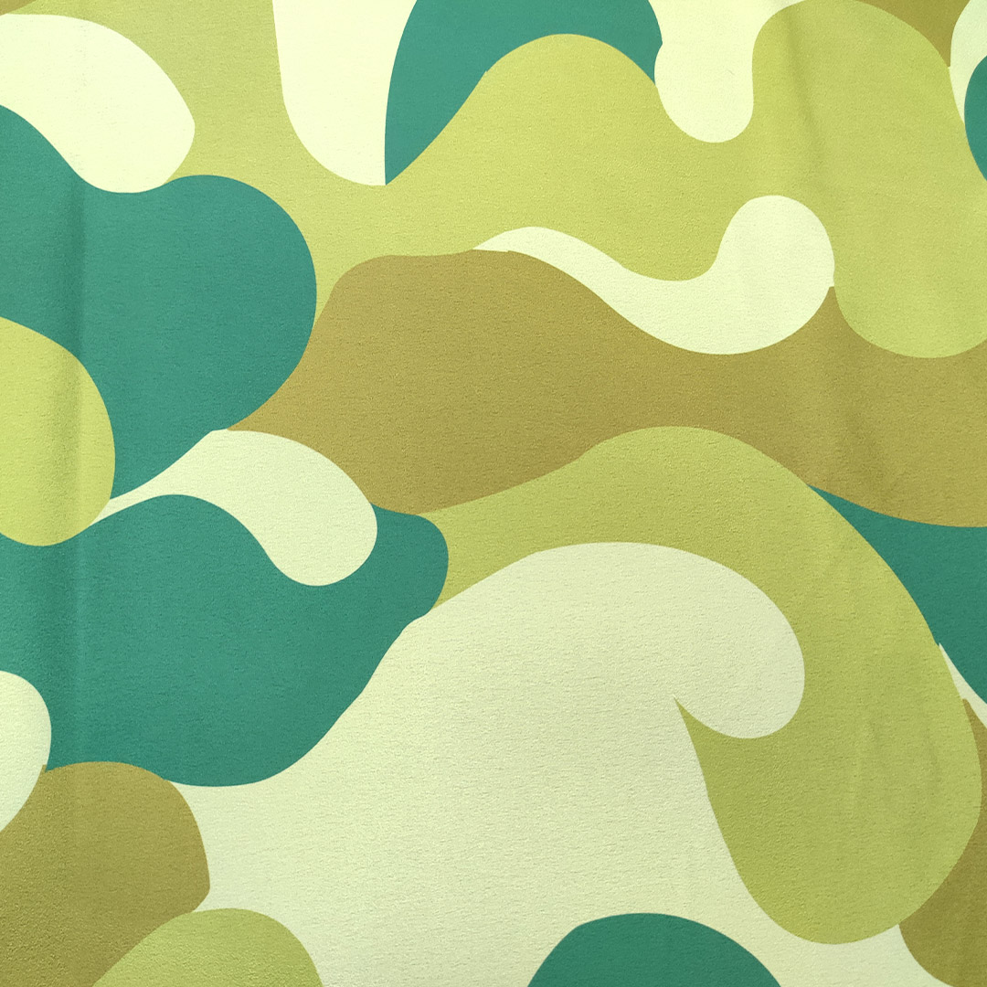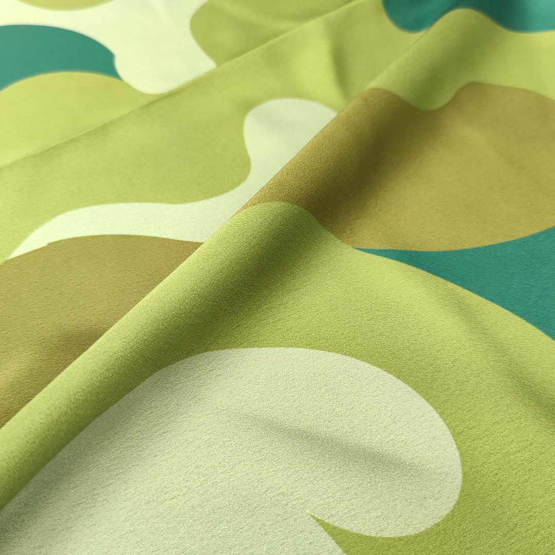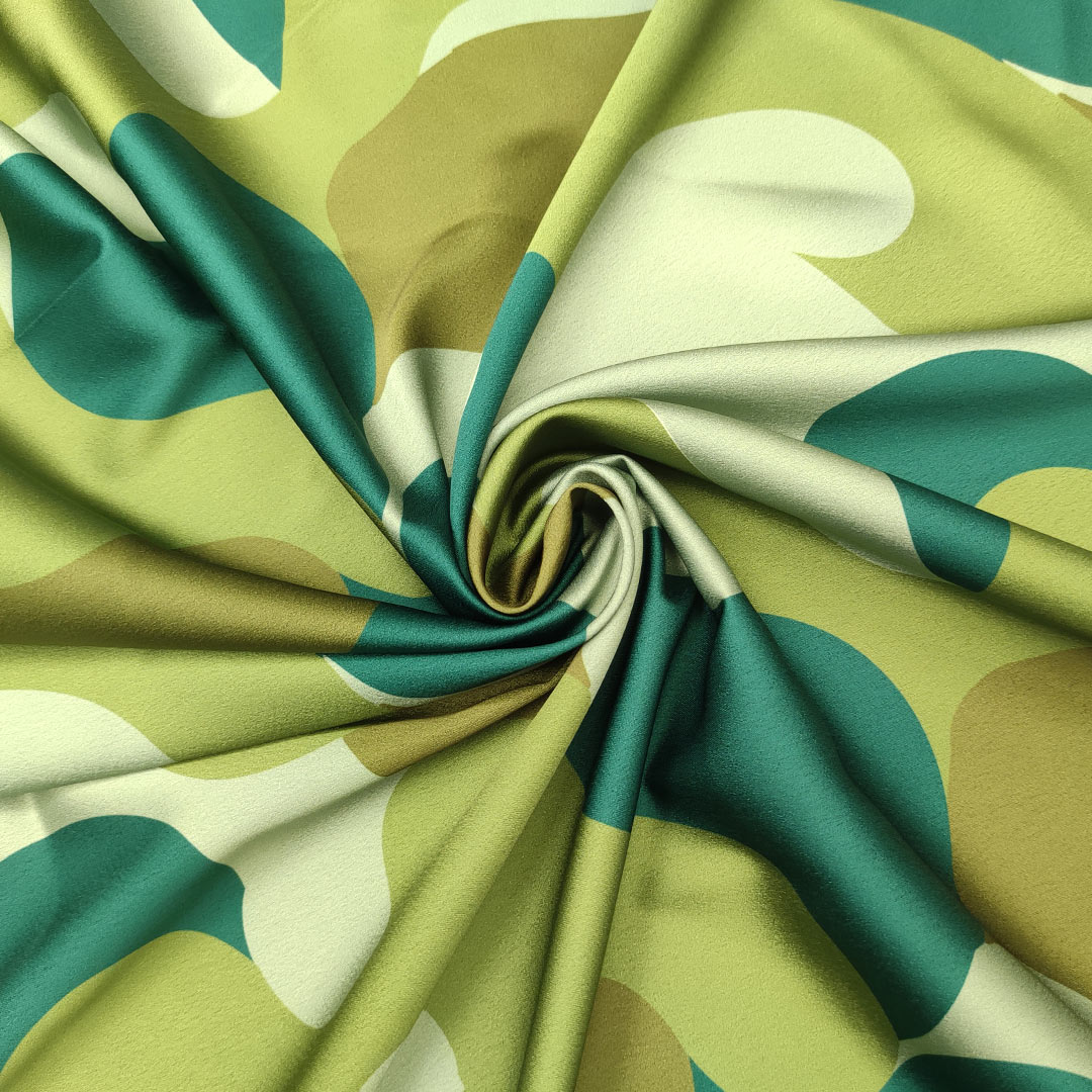 Tessuto Satin elasticizzato a fantasia motivo astratto verde salvia – verde smeraldo – verdino