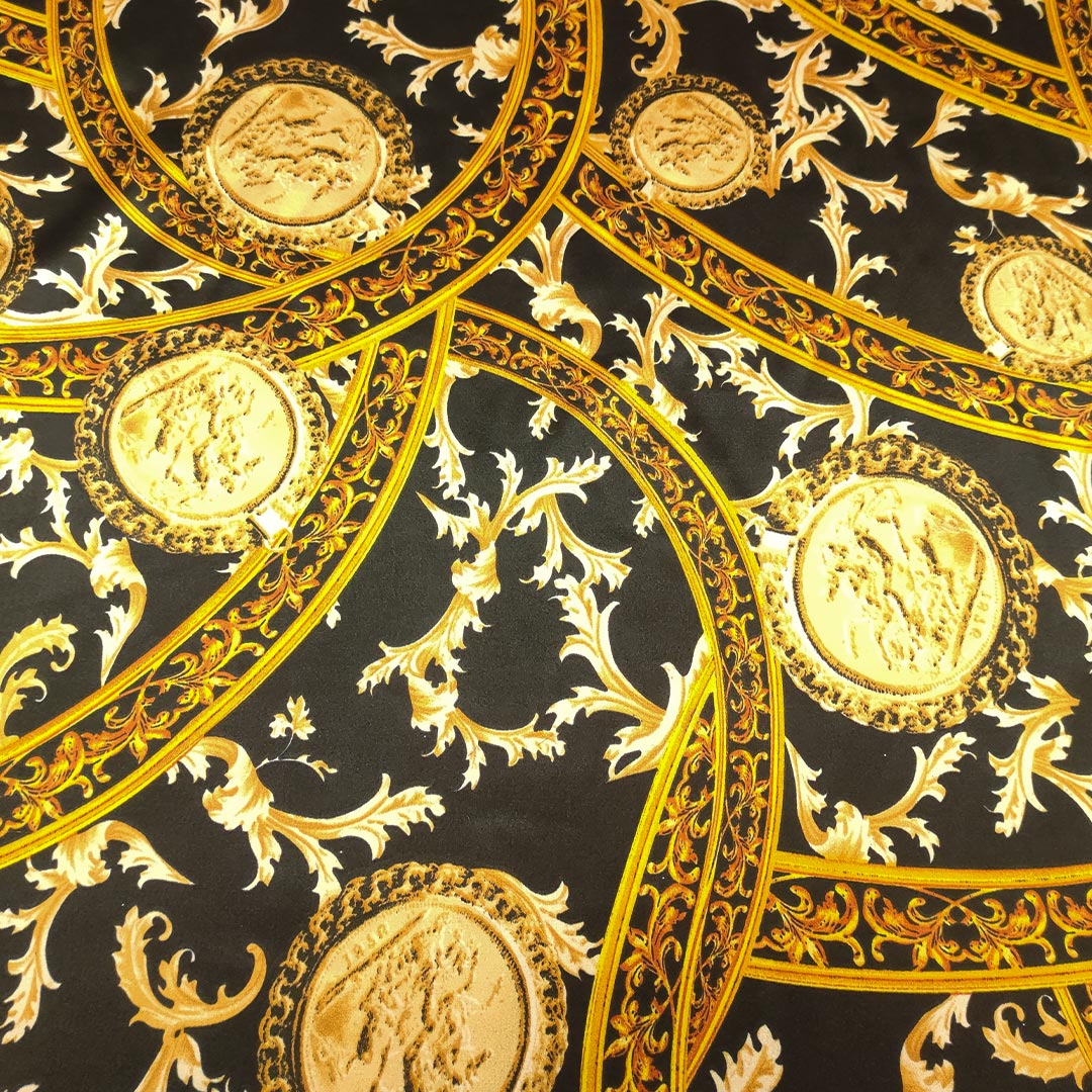 Tessuto Satin elasticizzato a fantasia motivo floreale barocco oro – nero