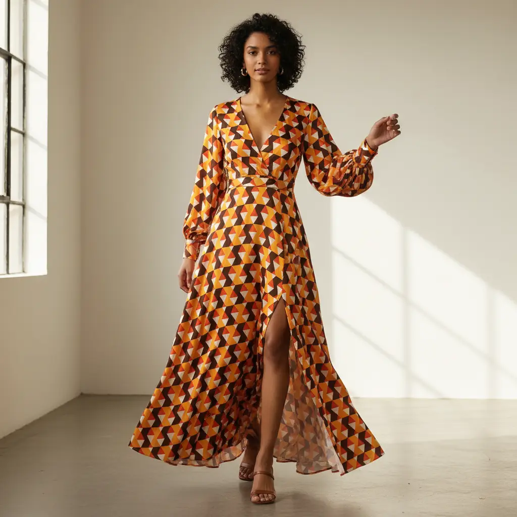 Tessuto Satin elasticizzato a fantasia motivo geometrico arancione – cioccolato – bianco