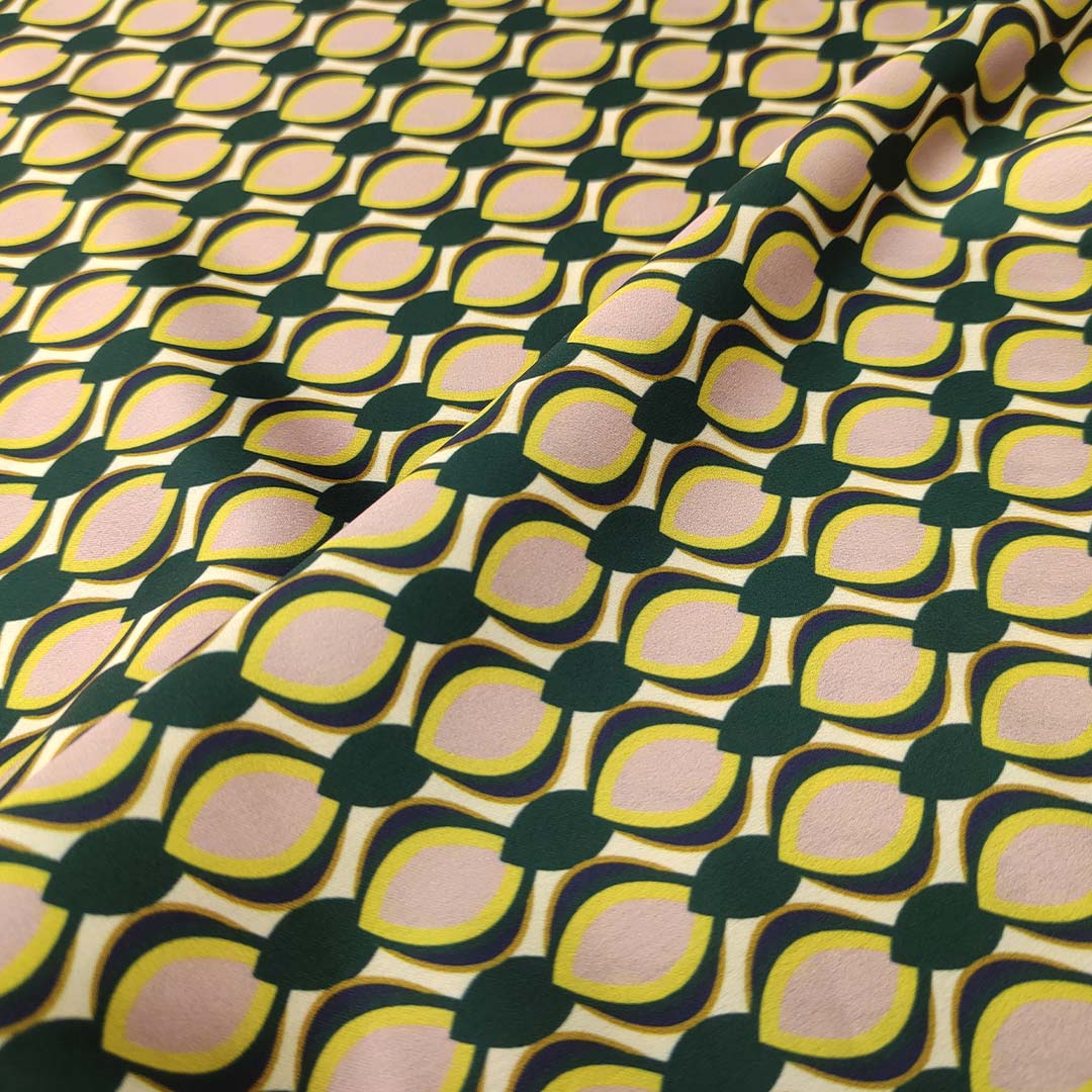 Tessuto Satin elasticizzato a fantasia motivo geometrico verde petrolio – rosa – lime