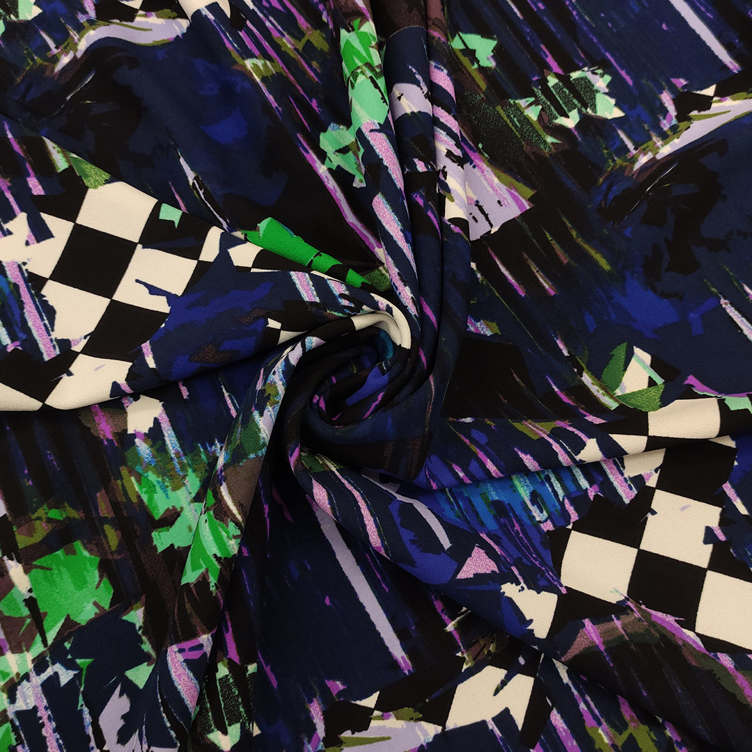 Tessuto Scuba Crepe a fantasia motivo astratto blu – verde – viola