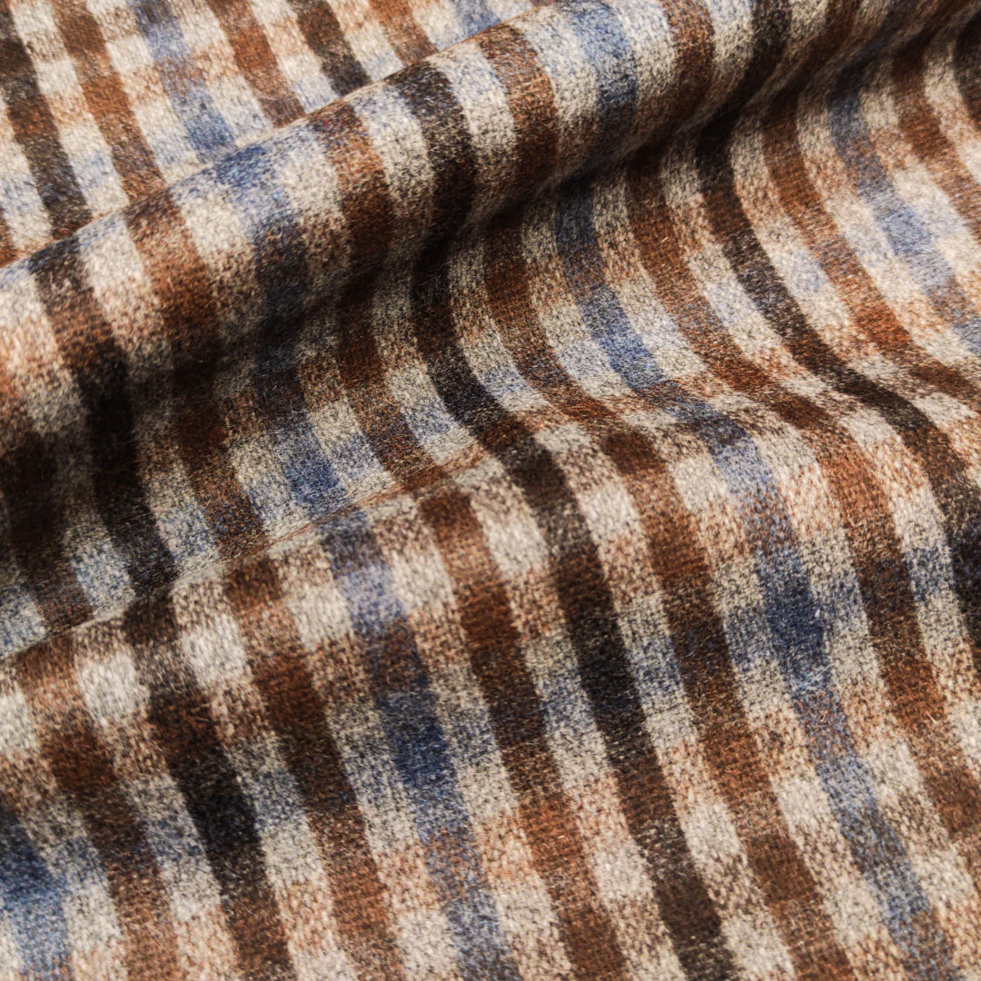 Tessuto pettinato mano lana motivo quadri celeste – marrone – grigio