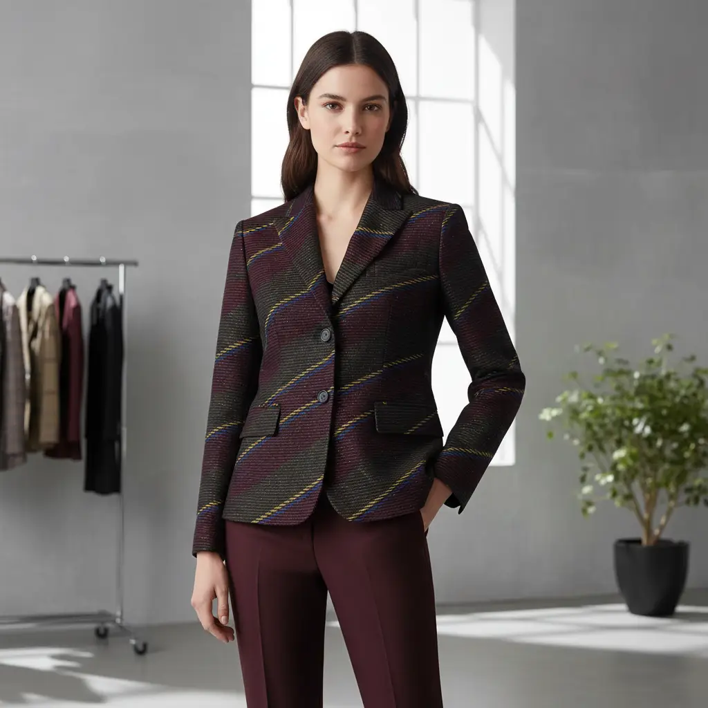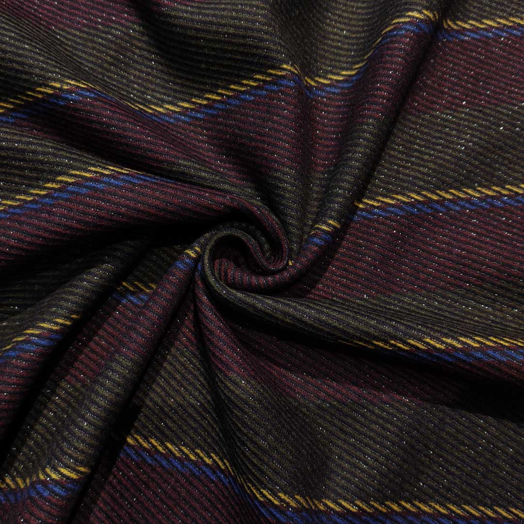 Tessuto pettinato mano lana peso giacca motivo rigato lurex blu – bordeaux – giallo