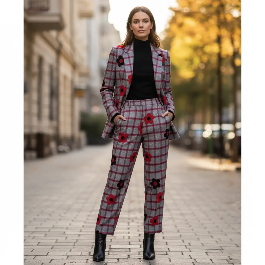Tessuto pettinato motivo quadri ricamato con fiori dalla mano morbida, rasata e calda, leggermente elasticizzato si presta alla creazione di capi da utilizzare nella stagione autunno – inverno come: giacche, gonne, pantaloni, abiti e tailleur.