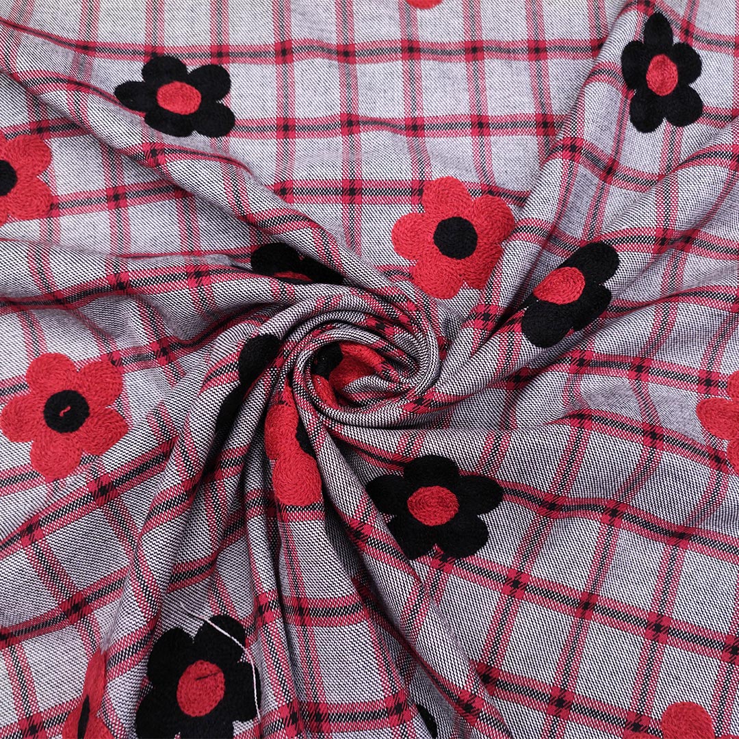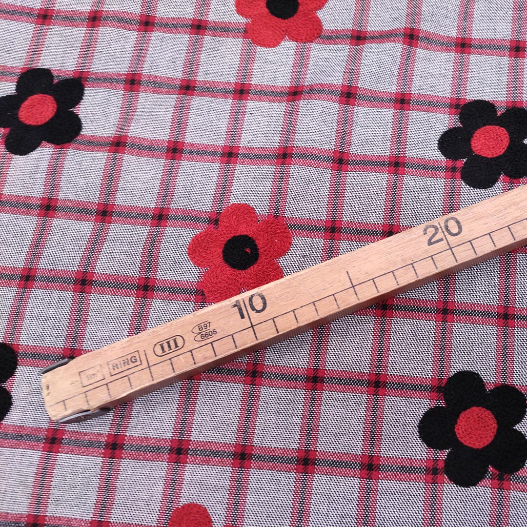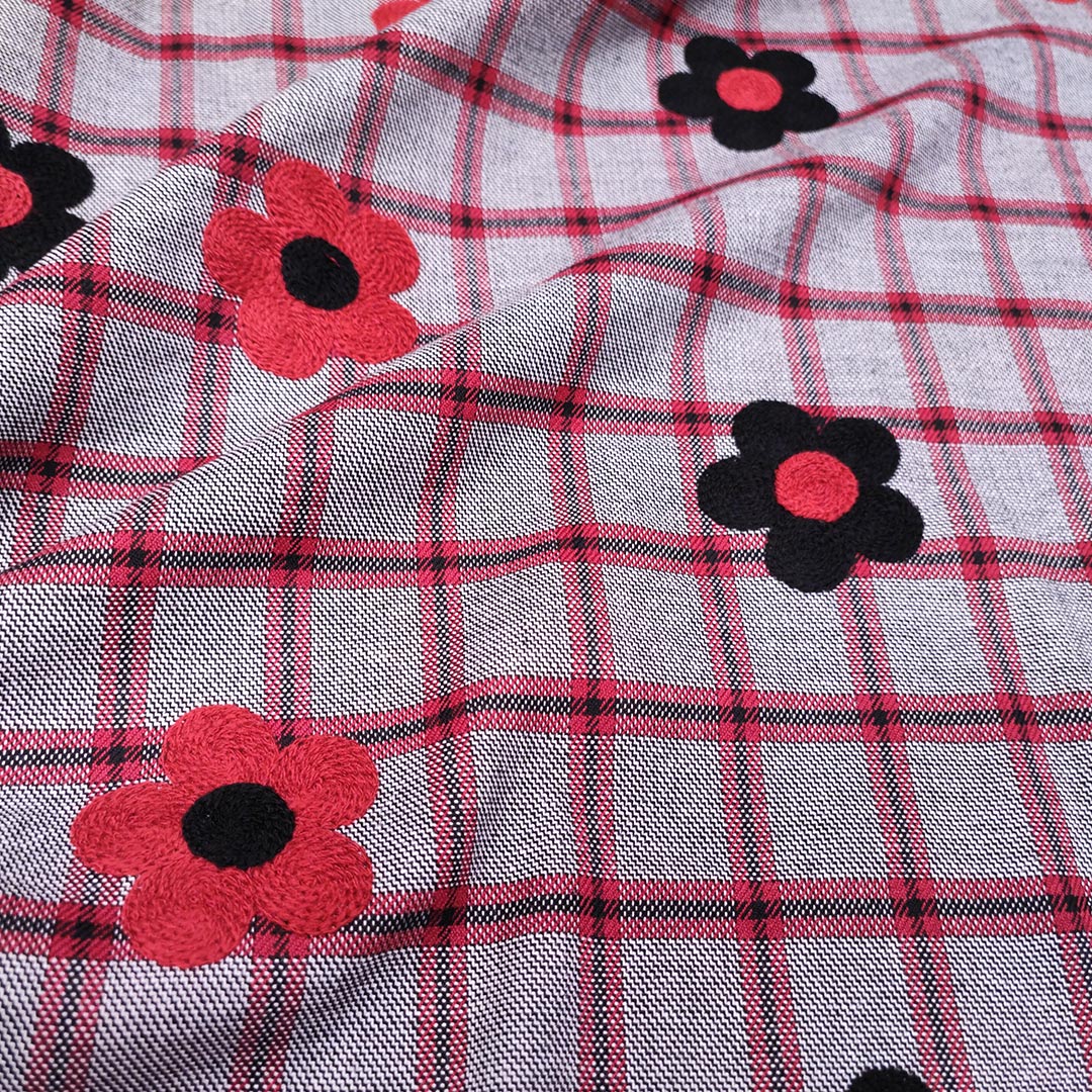 Tessuto pettinato motivo quadri ricamato con fiori grigio – rosso – nero