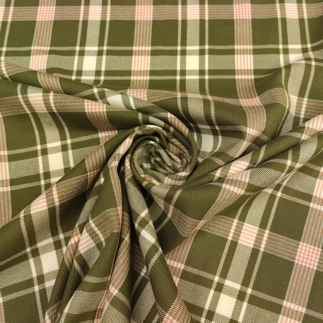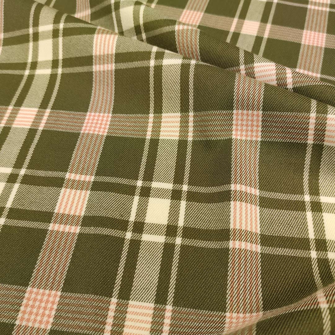 Tessuto pettinato motivo quadri verde militare – rosa salmone – bianco