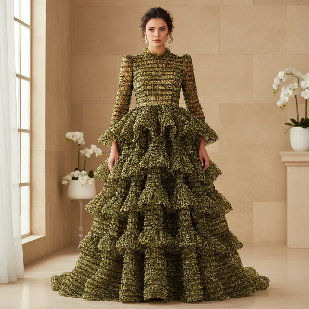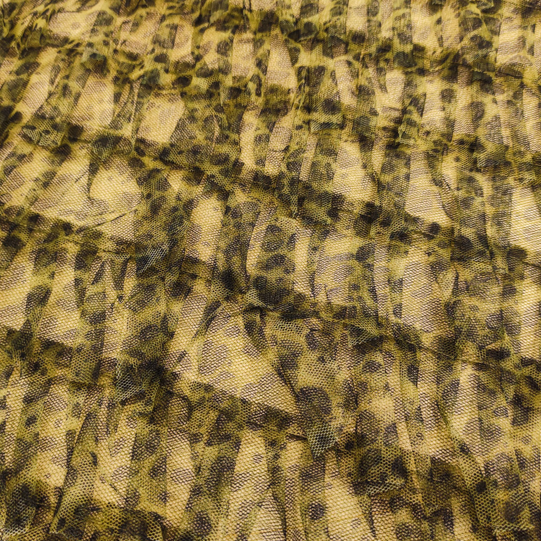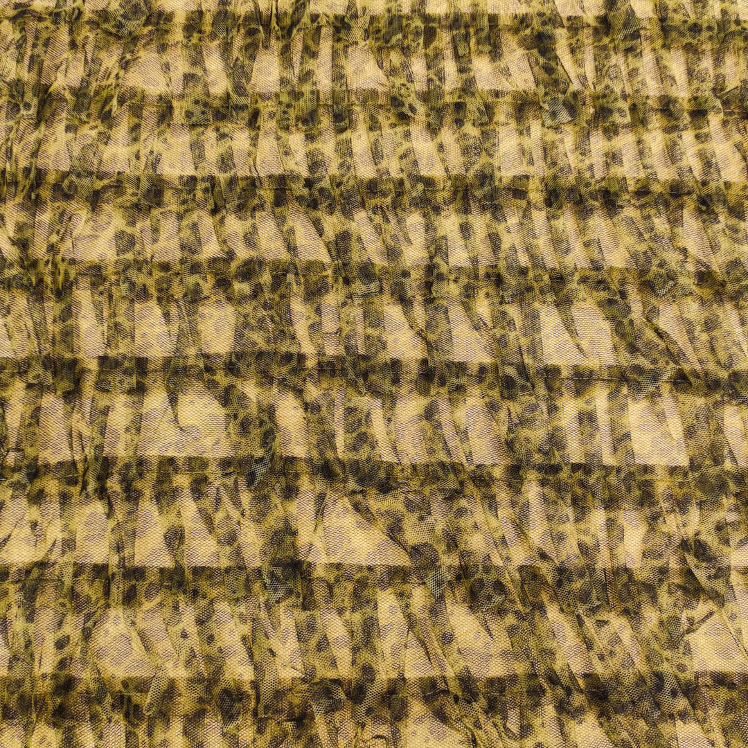 Tessuto Tulle mano seta con balze 3D in tulle motivo animalier verde – nero