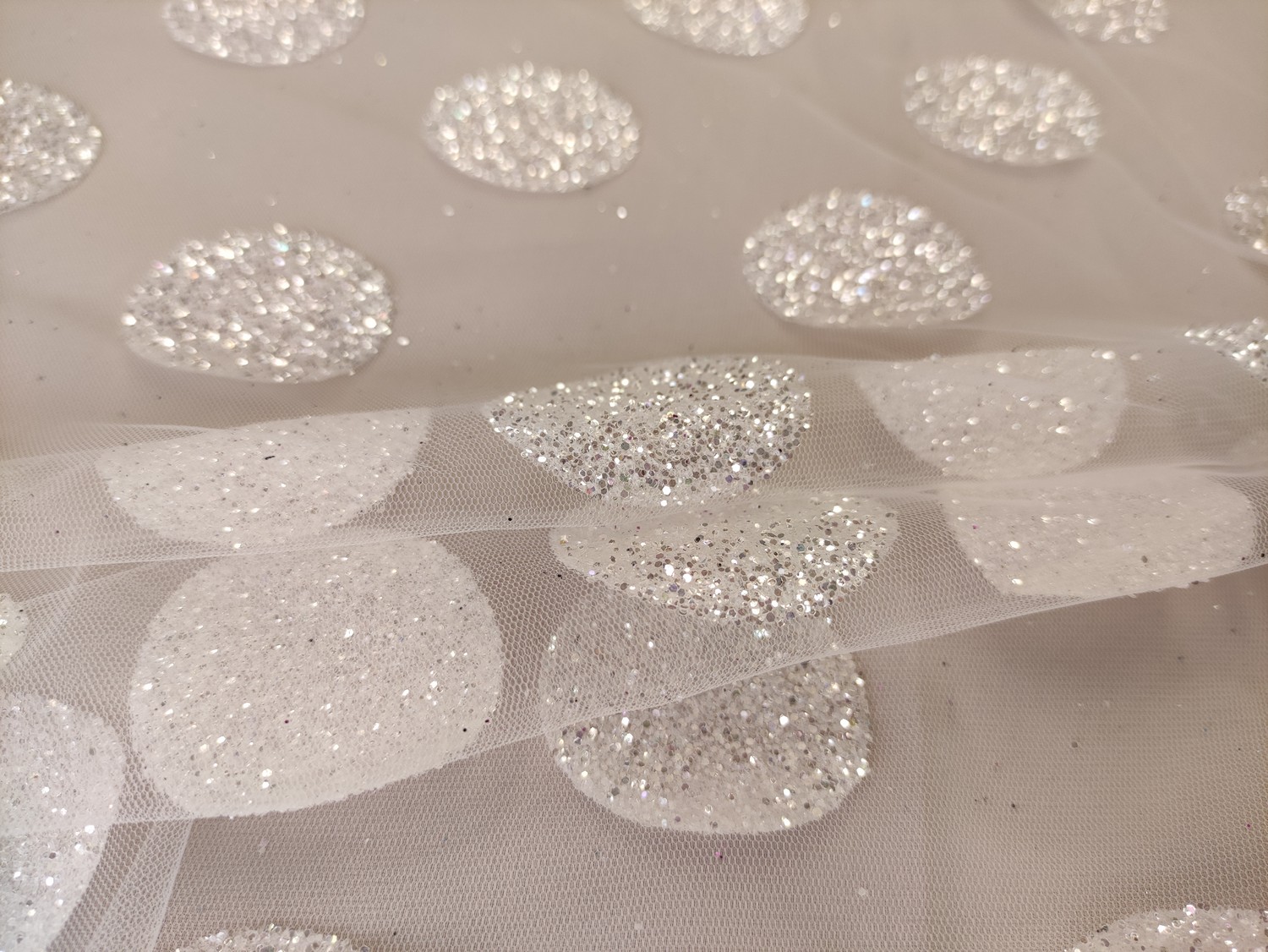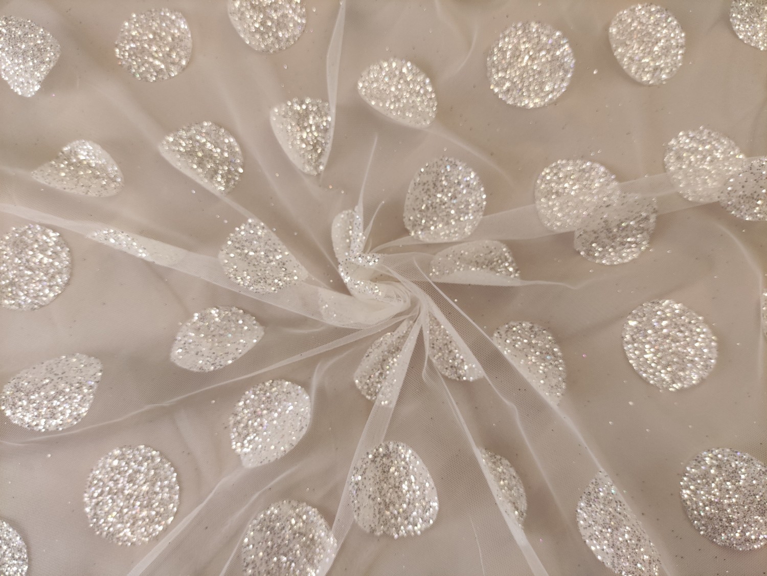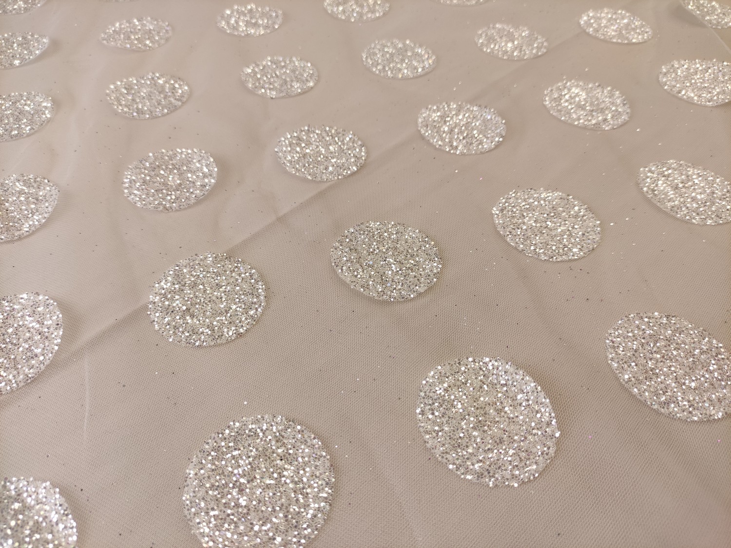 Tessuto Tulle mano seta con glitter dalla mano morbida e dall’ aspetto lucente e scintillante, ideale per realizzare capi da cerimonia e per le grandi occasioni.