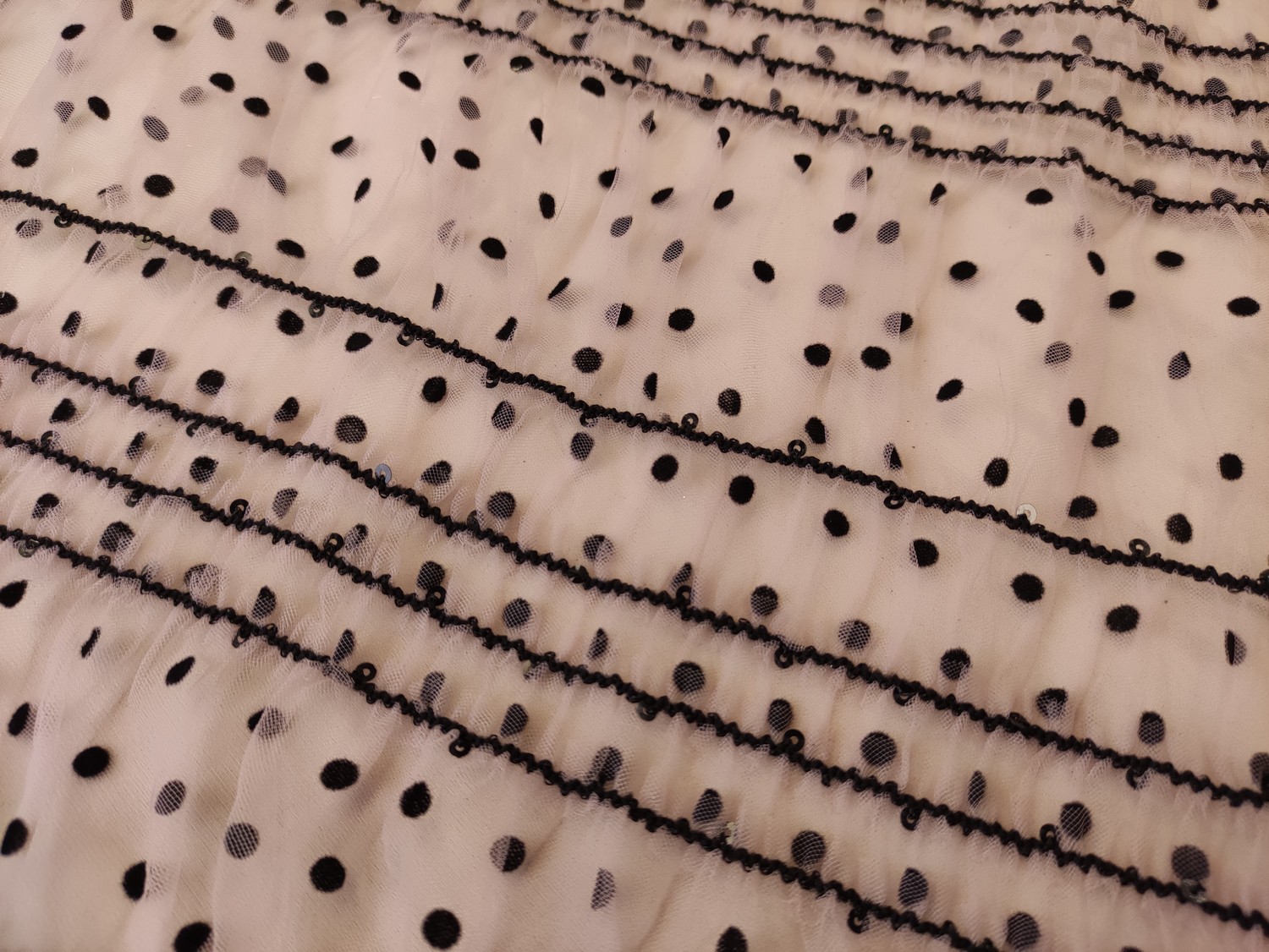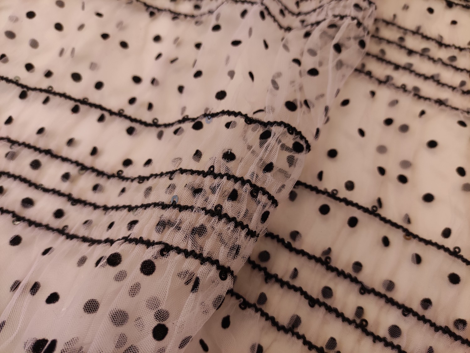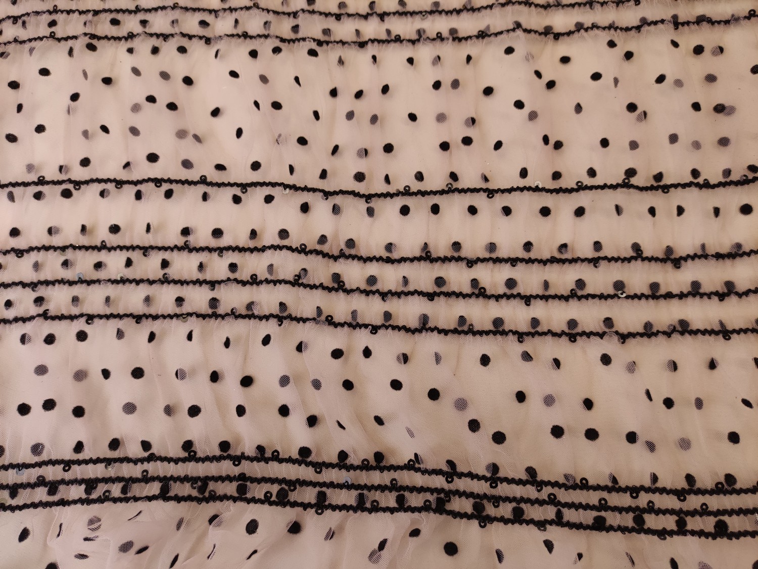Tessuto Tulle mano seta a pois dalla mano morbida, voluminosa e fluente, ideale per creare capi sartoriali da cerimonia e per le grandi occasioni originali e alla moda.